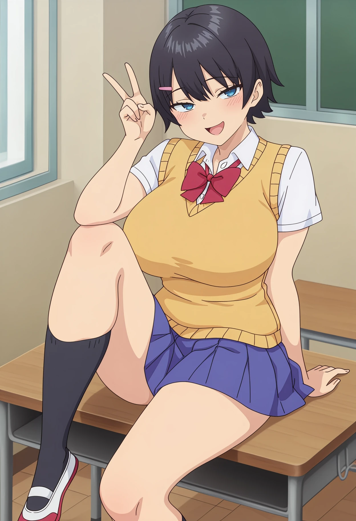 1girl,solo,anime coloring,mm,short hair,black hair,blue eyes,pink hairclip,large breasts