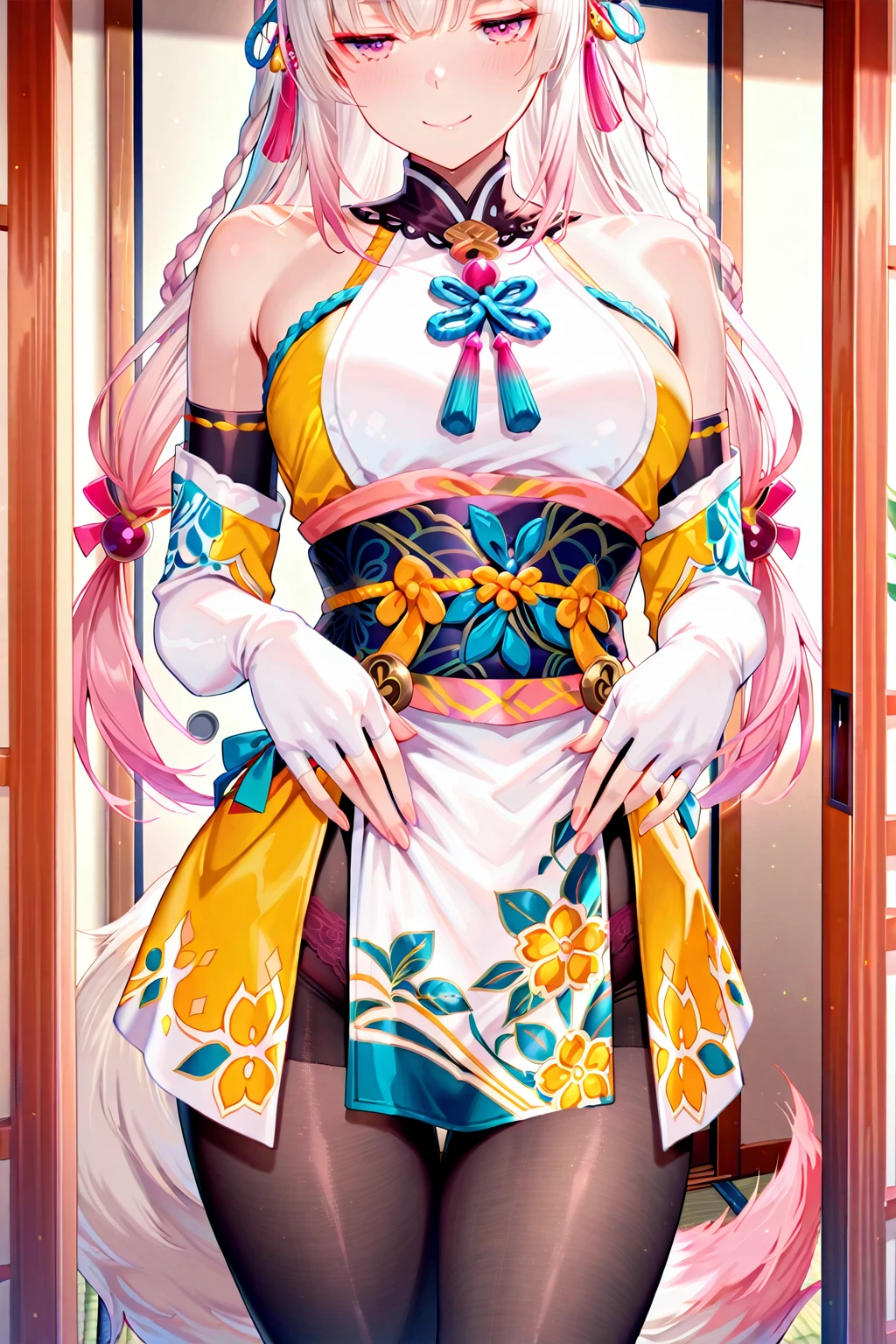 short kimono,white gloves,underpants under pantyhose,bare shoulders,black pantyhose,floral print,detached sleeves,fingerless_gloves,sash,obi,sandals,