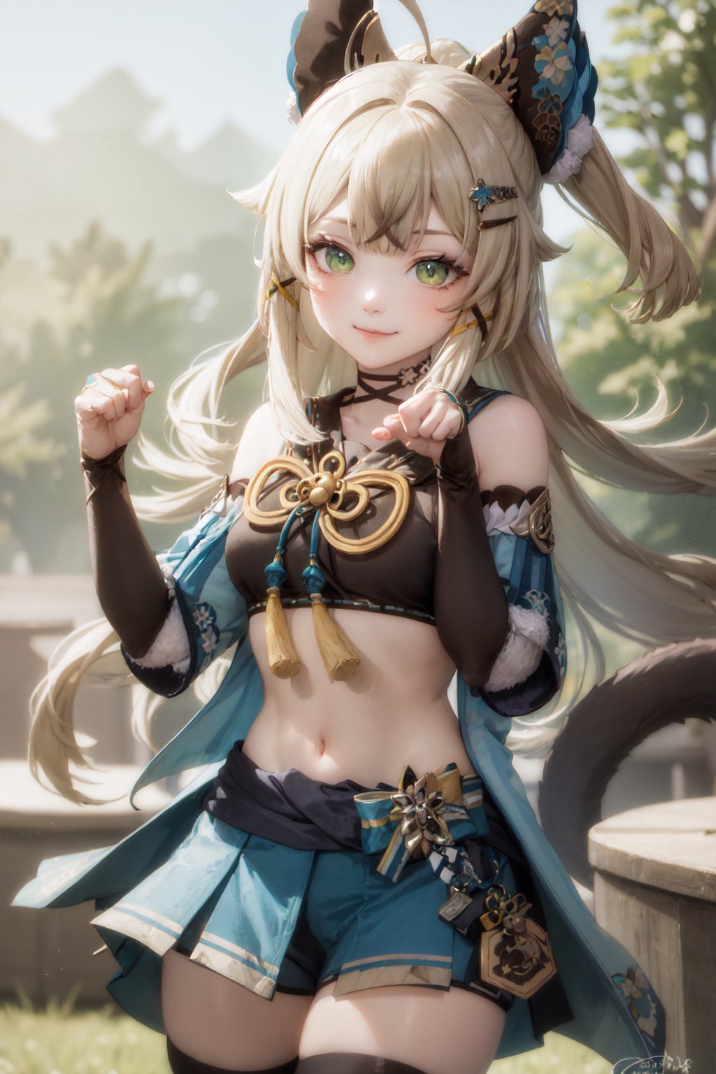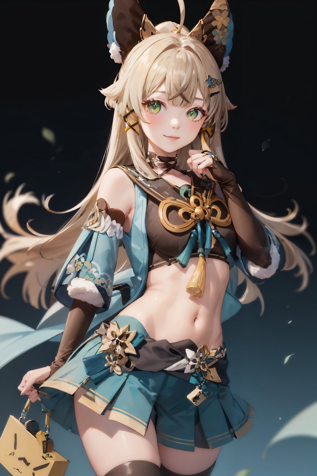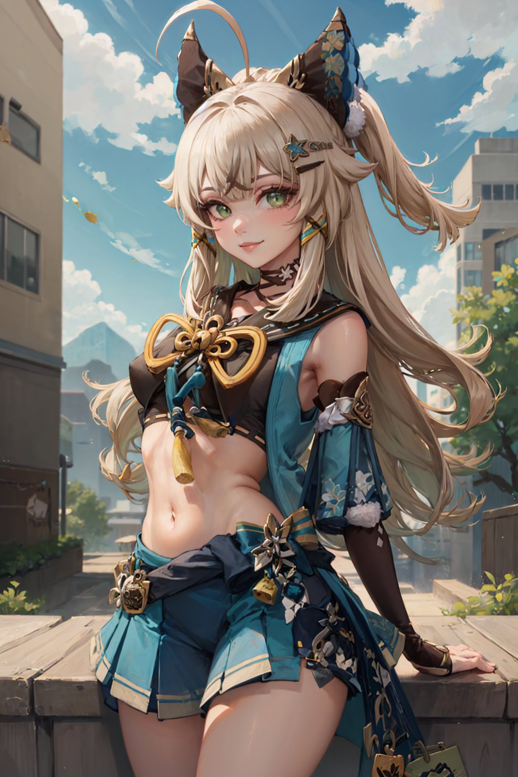 Default Outfit: detached sleeves, blue miniskirt, gloves, tassel, midriff