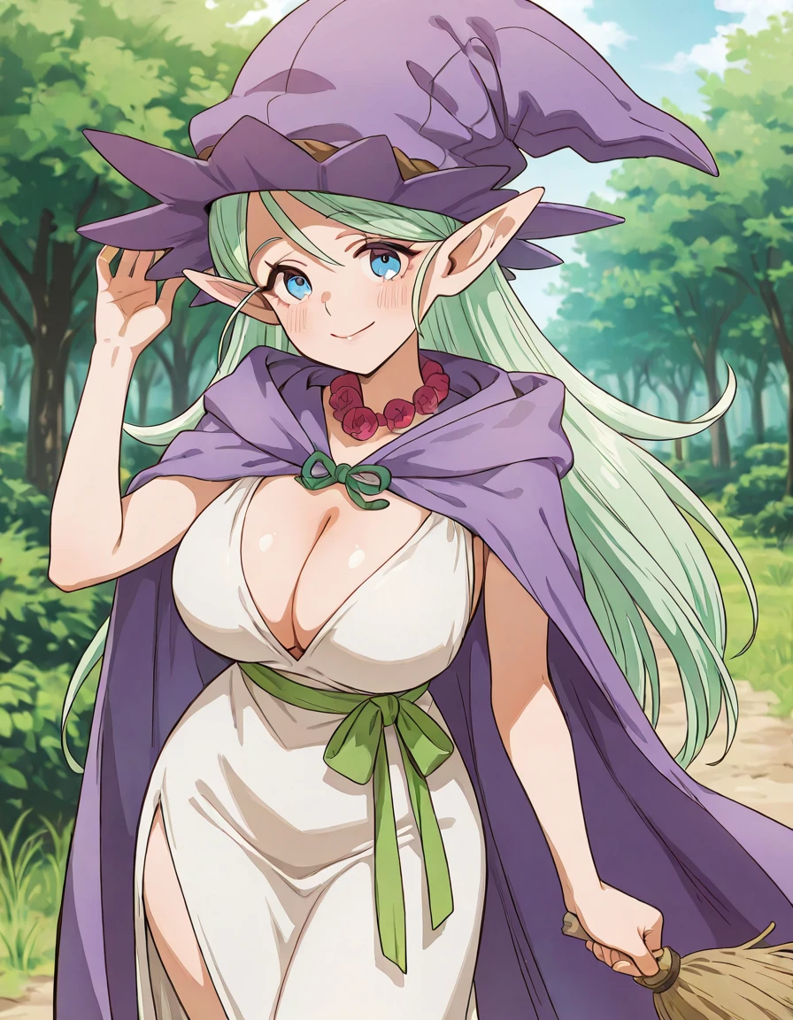 Ameliachan, long hair, elf, pointy ears, large breasts, witch hat, long dress, green hair, blue eyes