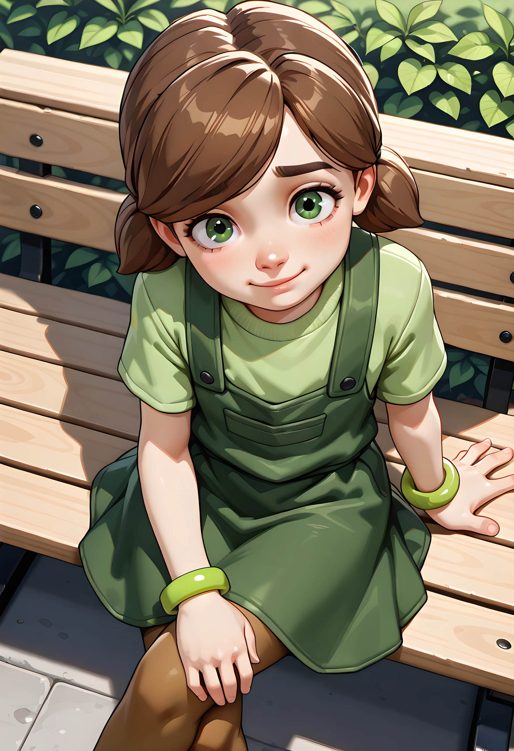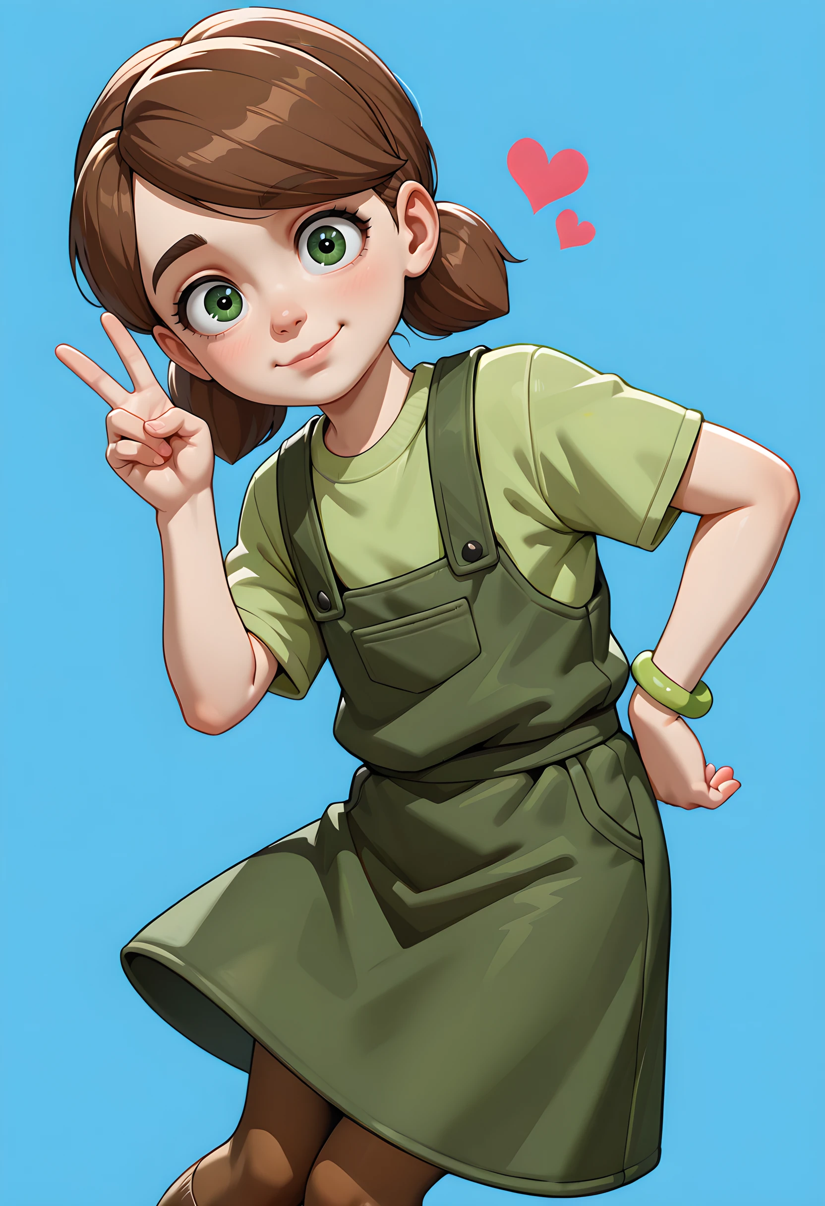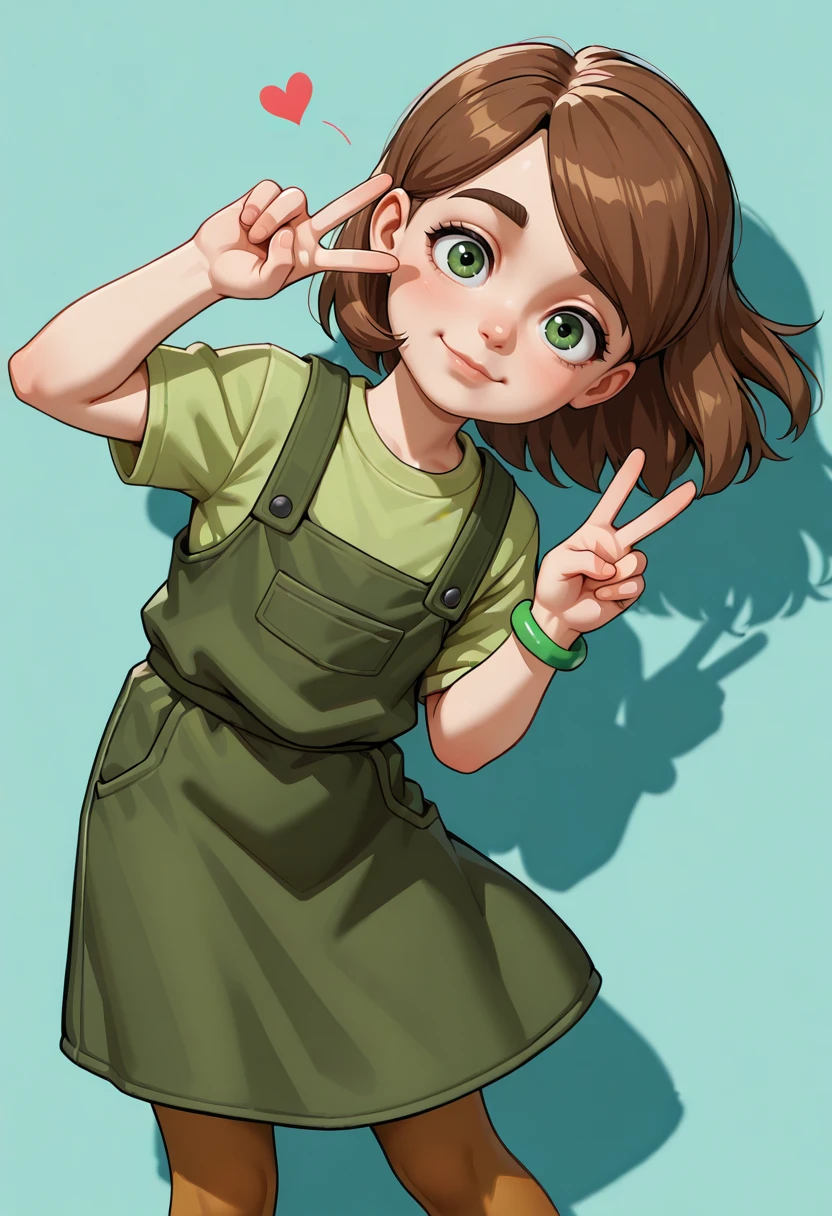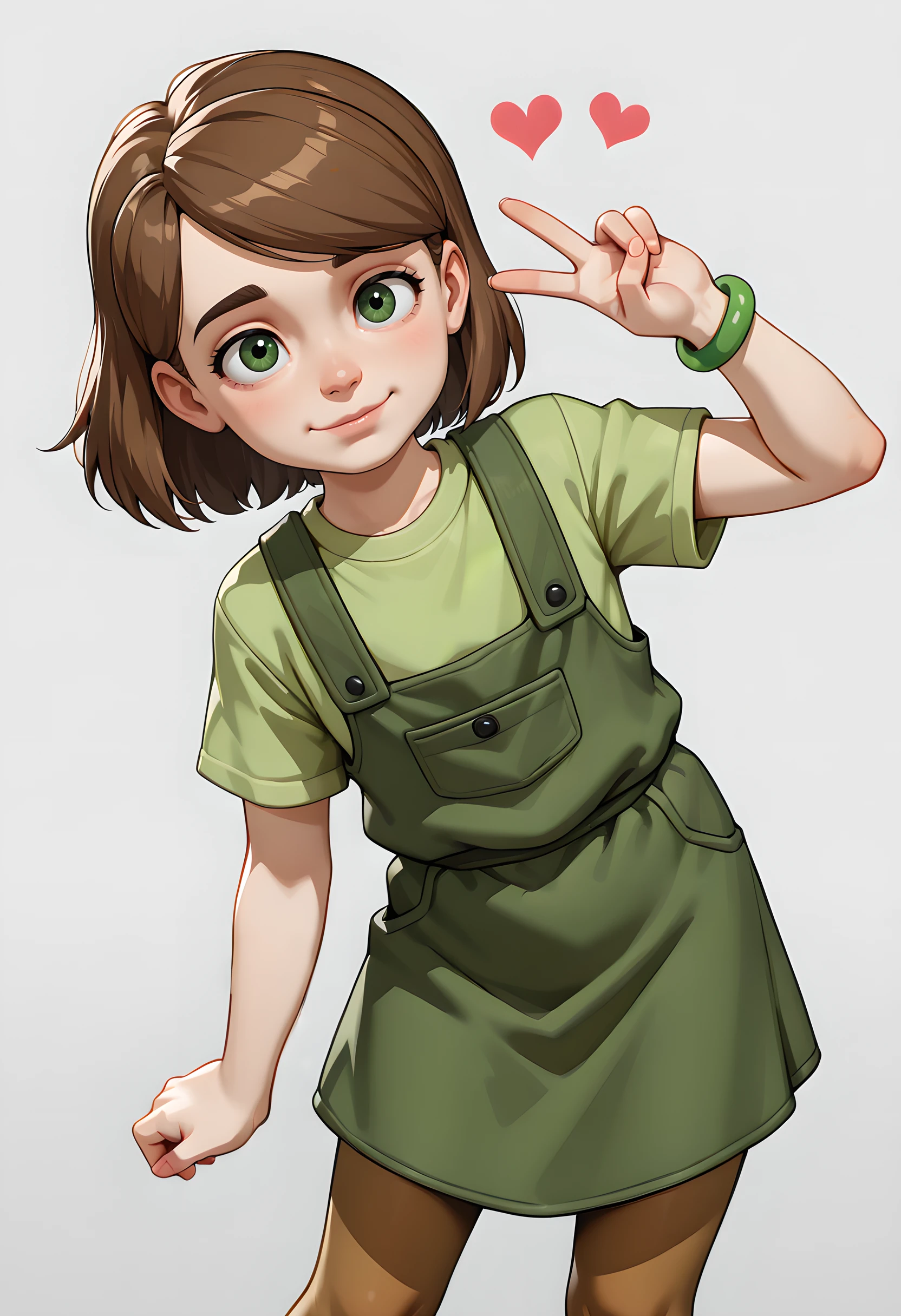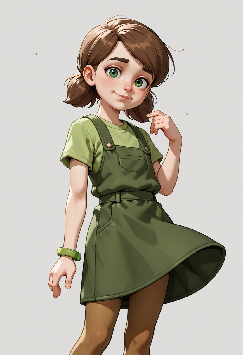 legwear ,,tortilla brown legwear,lime green sweater,green overall with skirt,double bump hair,brown hair,green eyes,light skin,,green bracelet on hand ,short sleeves ,,small girl,bracelet on single hand