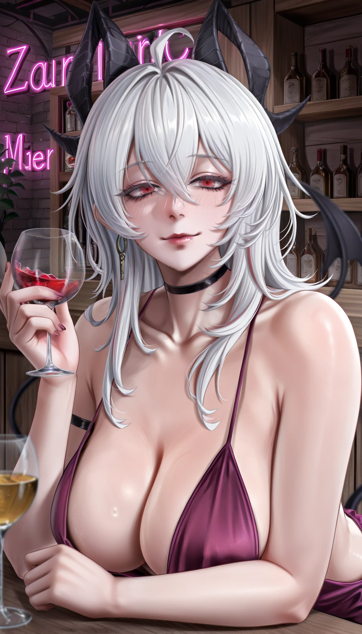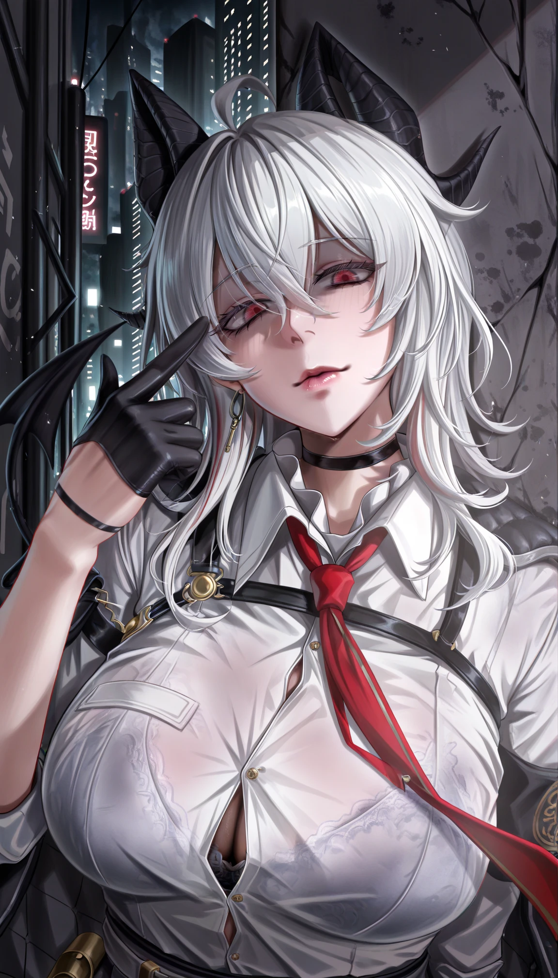 zani_wuwa, red eyes, white hair, hair between eyes, long hair, messy hair, ahoge, demon girl, horns, demon tail, jewelry, single earring, key earring, black choker, white shirt, button gap, collared shirt, armband, arm pouch, red necktie, black jacket, jacket on shoulders, black gloves, half gloves, belt, black pants, bra visible through clothes, black bra, harness, Description