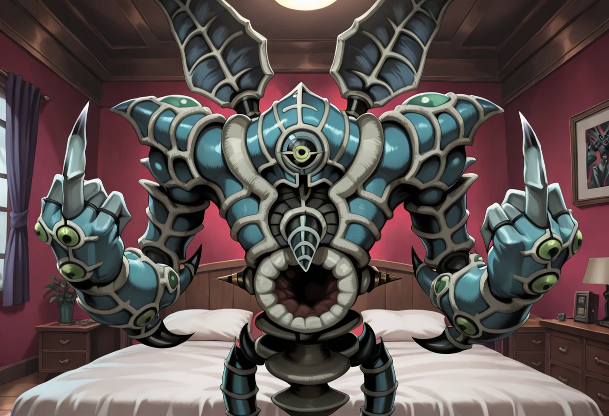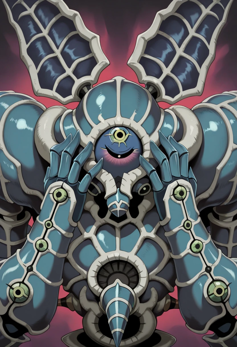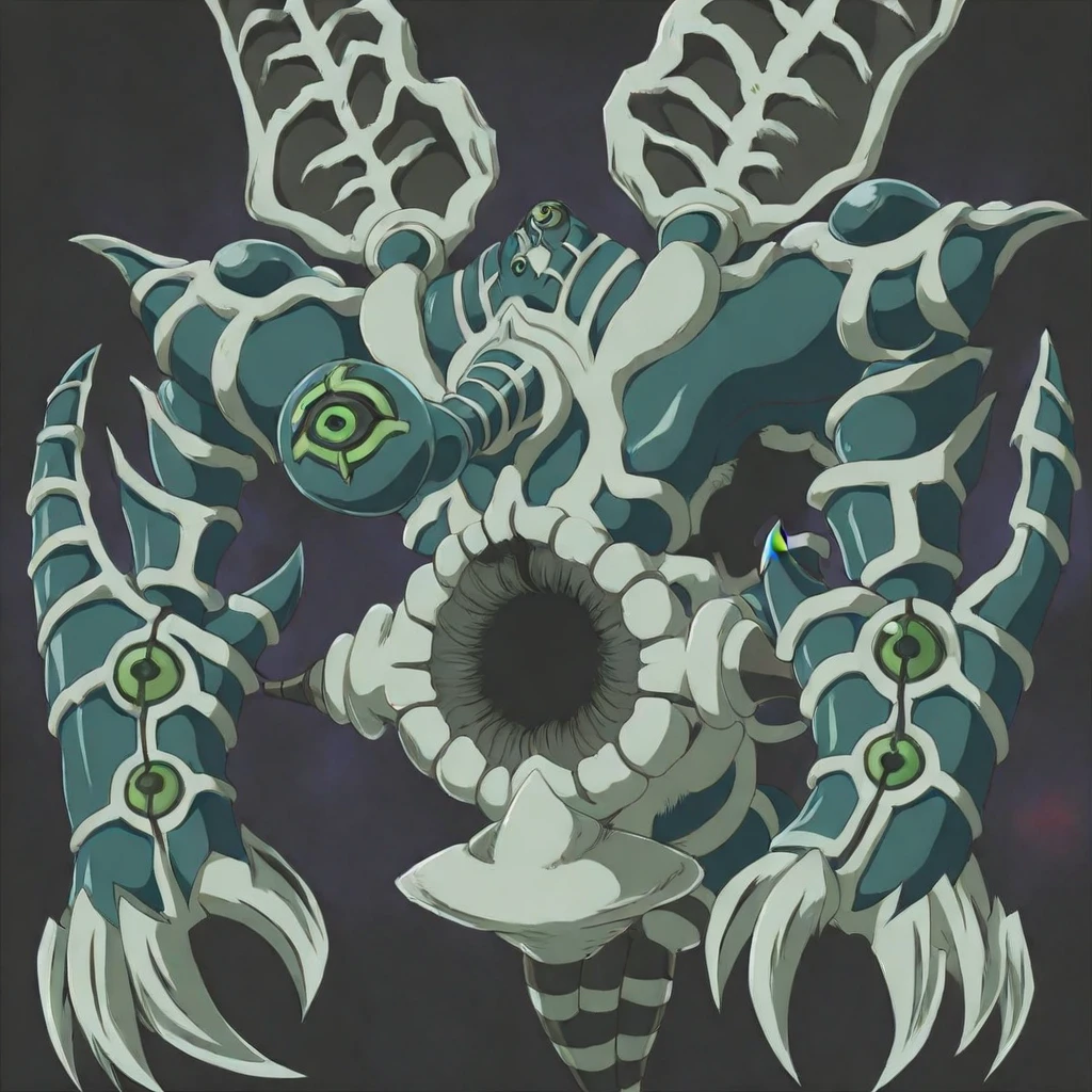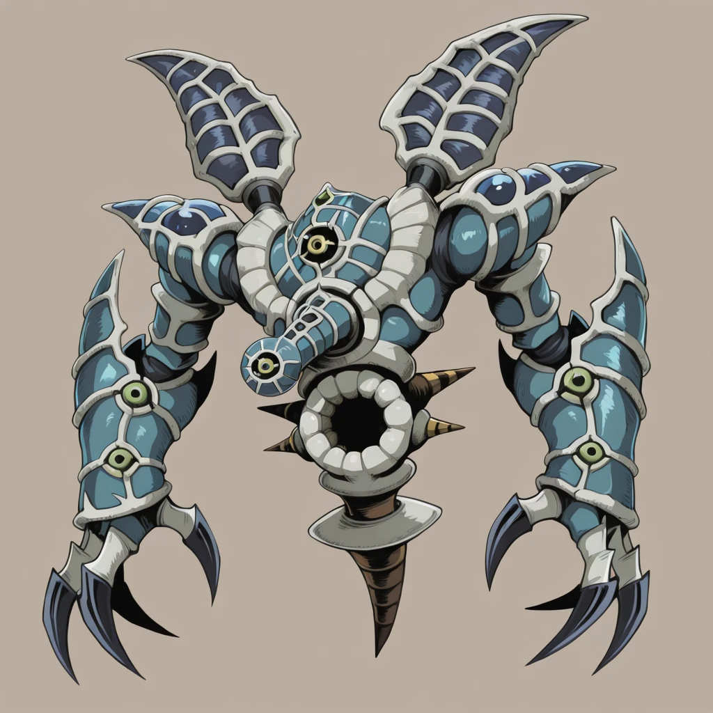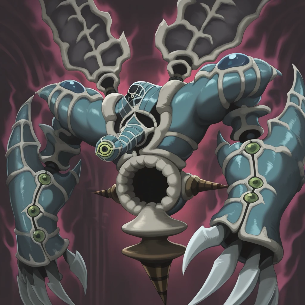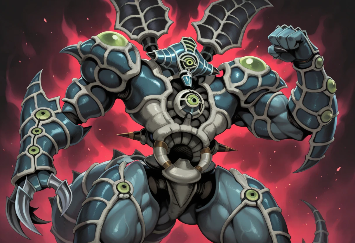 yugioh, blue body, bone armor, skeletal wings, single eye,claws, unique lower body, stomach hole, duel monster, monster, biomechanical