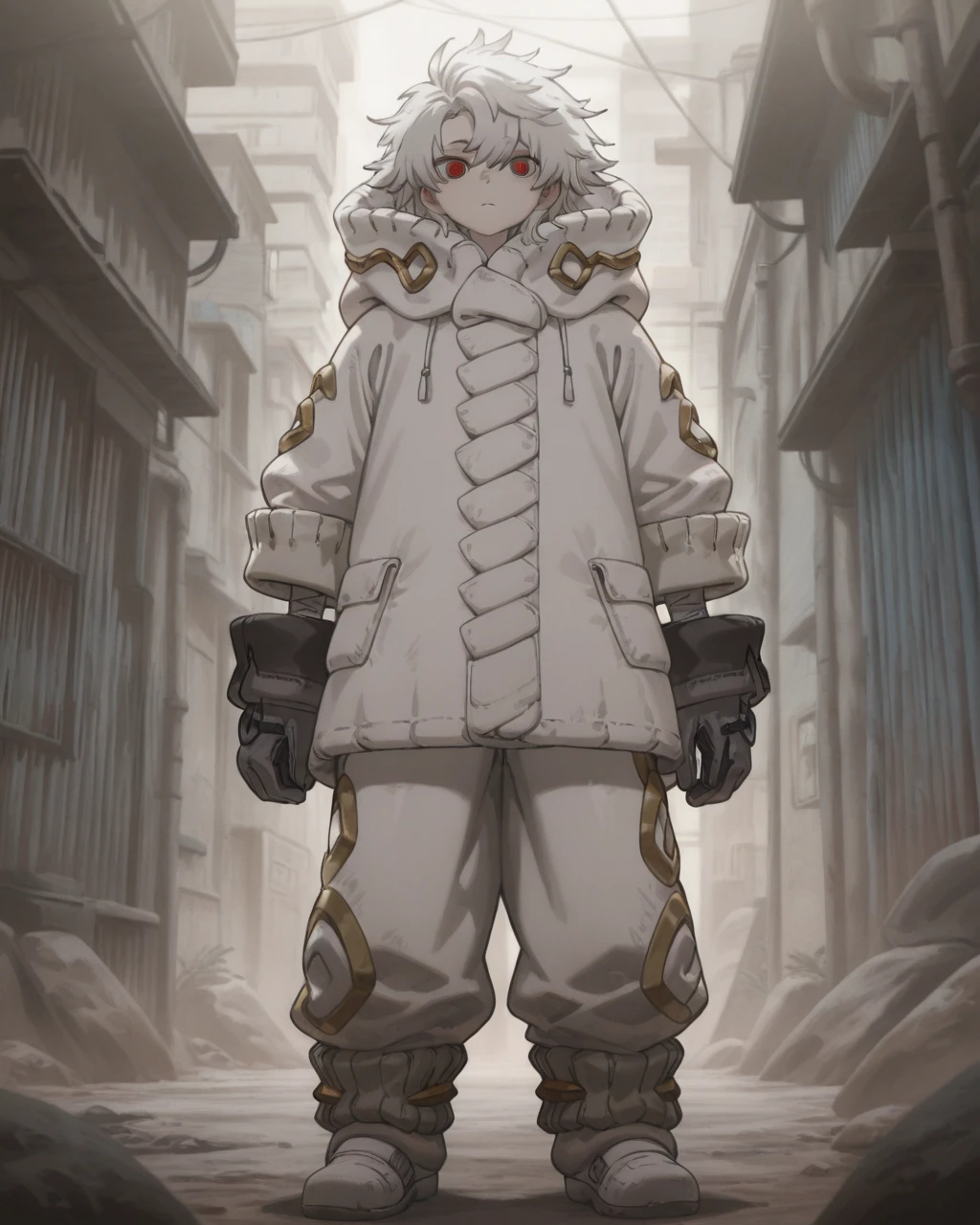 Clothes: white hooded coat, white pants, grey gloves, white boots