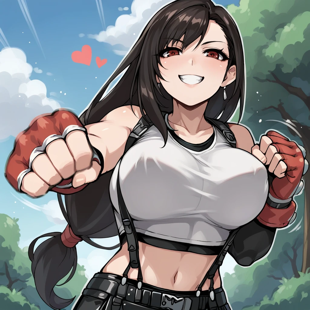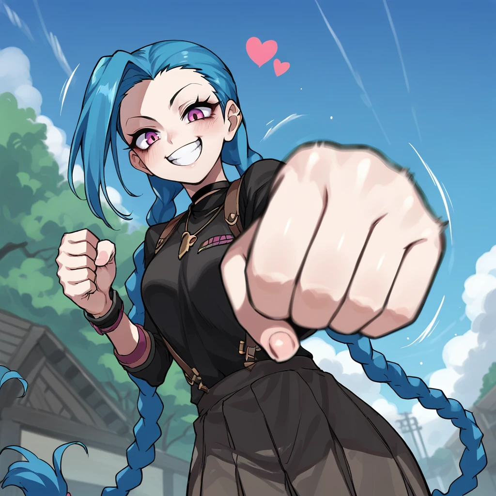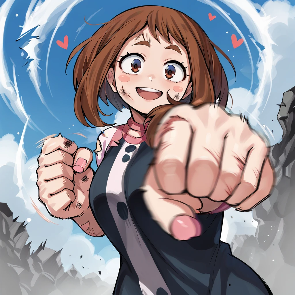 looking at viewer, punching, clenched hand, motion lines, motion blur