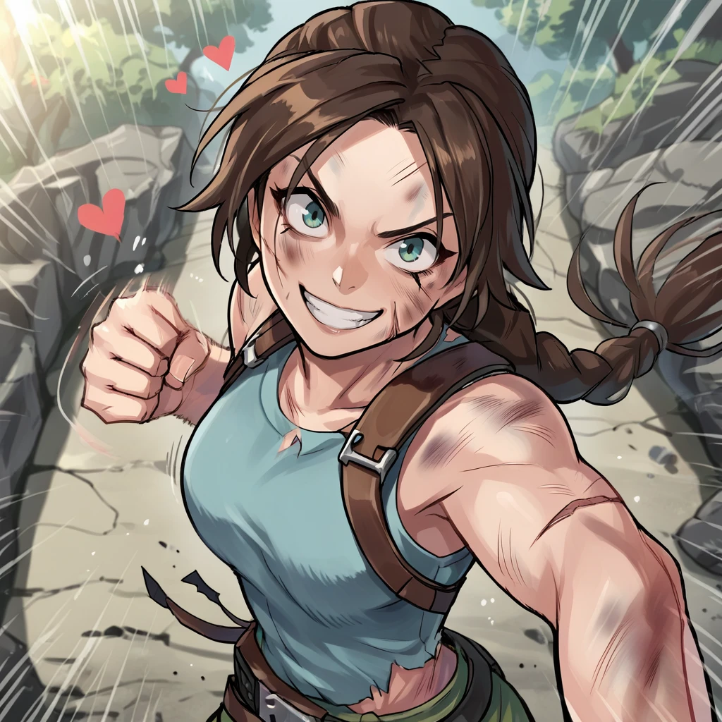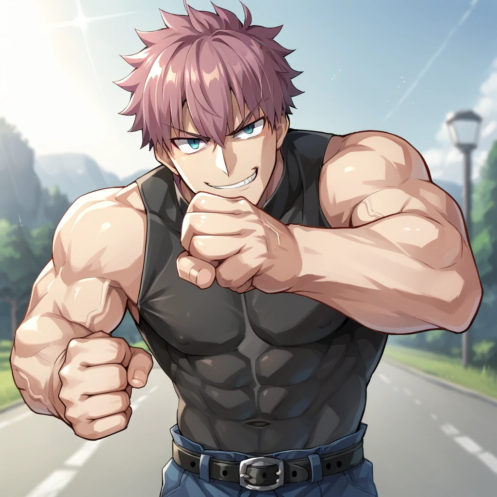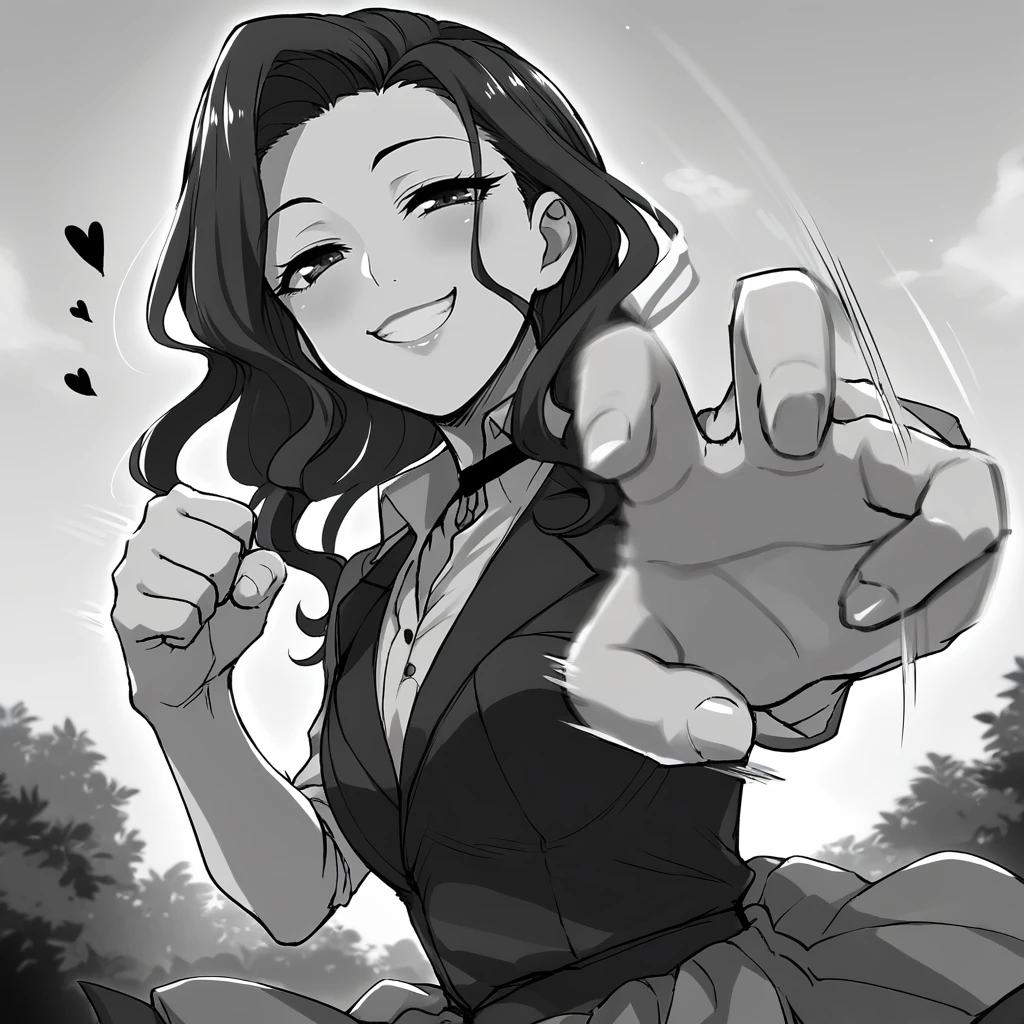 looking at viewer, punching, clenched hand, motion lines, motion blur