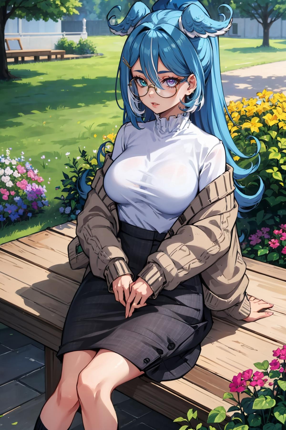 elira3st, long hair, heterochromia, round glasses, off shoulder, cardigan sweater, long sleeves, high-waist skirt, long skirt, hairclip, white socks, black footwear