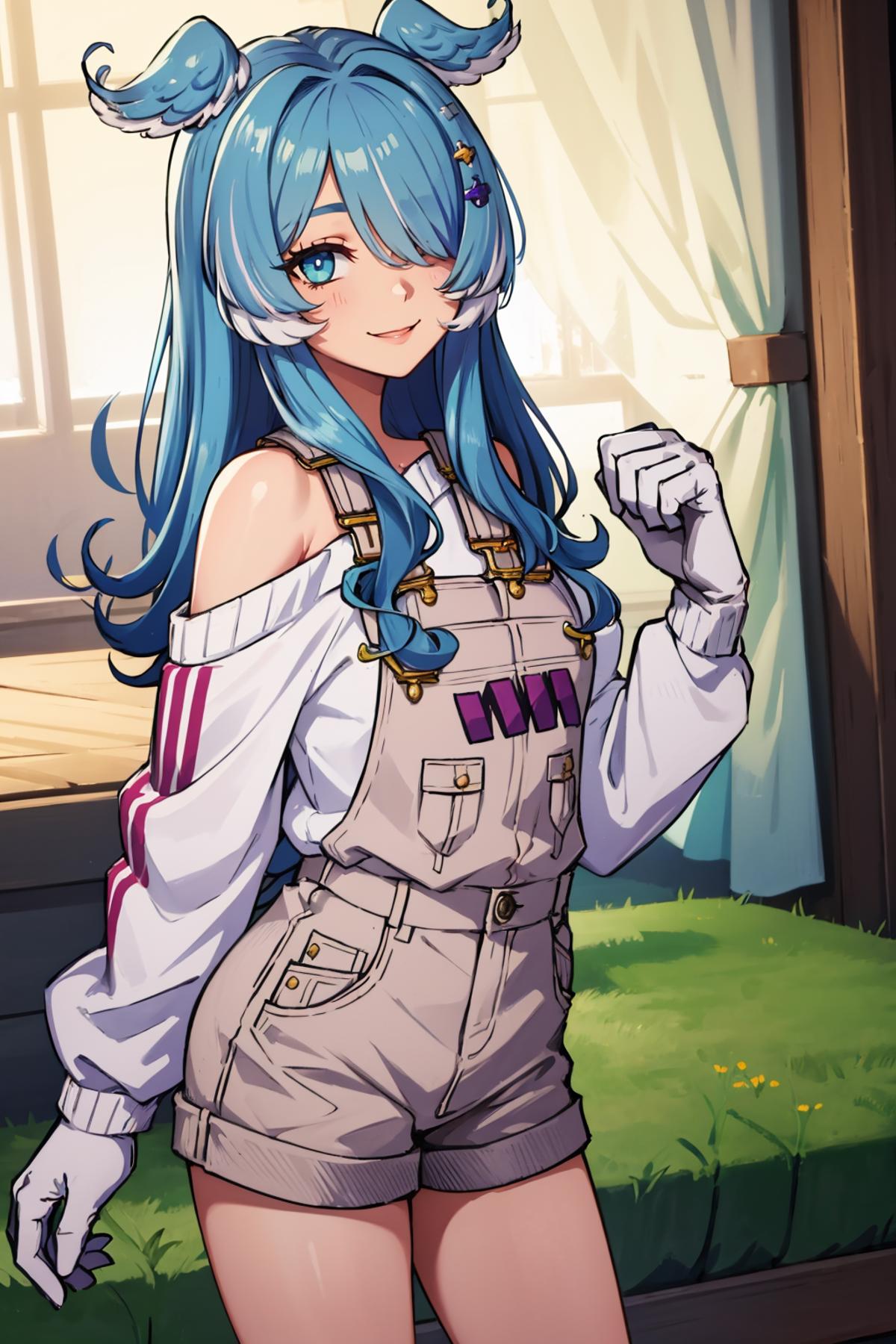 elira1st, long sleeves, overalls, white sweater, off shoulder, grey gloves, one eye covered, overall shorts