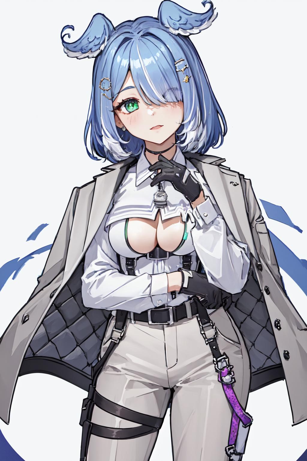 elira4st, short hair, green eyes, hairclip, hair ornament, one eye covered, cleavage cutout, white shirt, black gloves, jacket, long pants, grey pants, belt, thigh strap