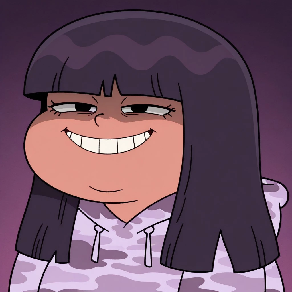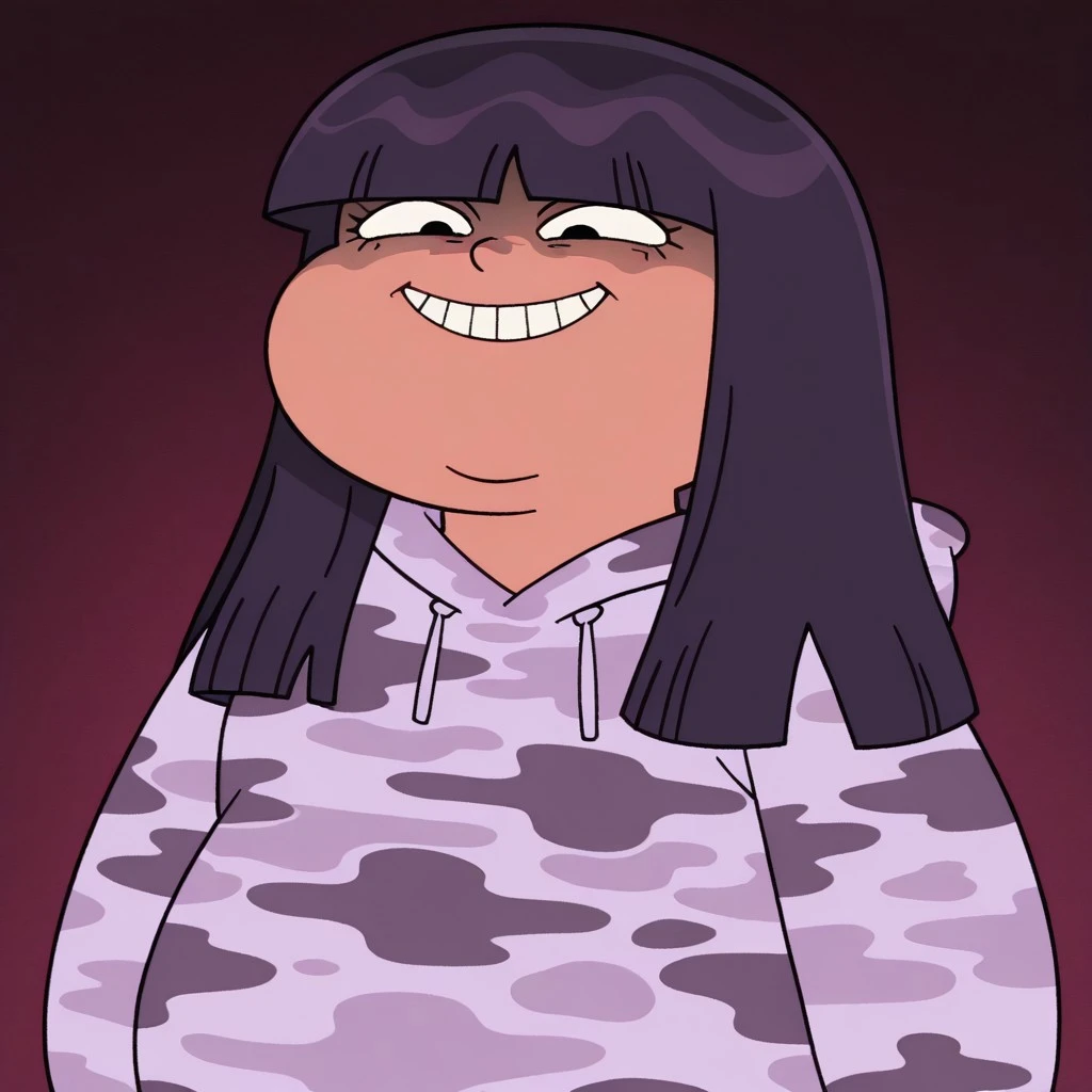 Prompt: LotLot Ramirez, solo, 1girl, chubby, brown skin, black eyes, long hair, bangs, dark purple hair, purple camo hoodie, green shorts, green and brown socks
