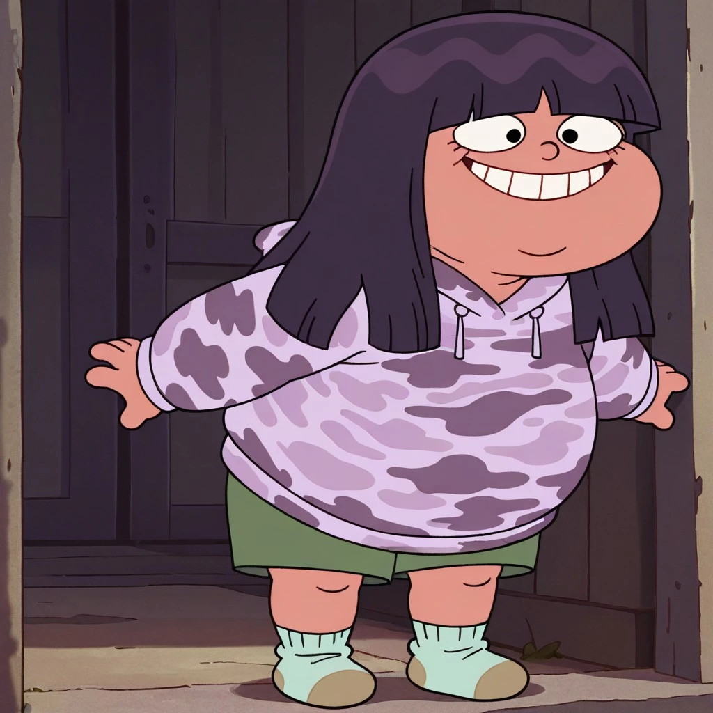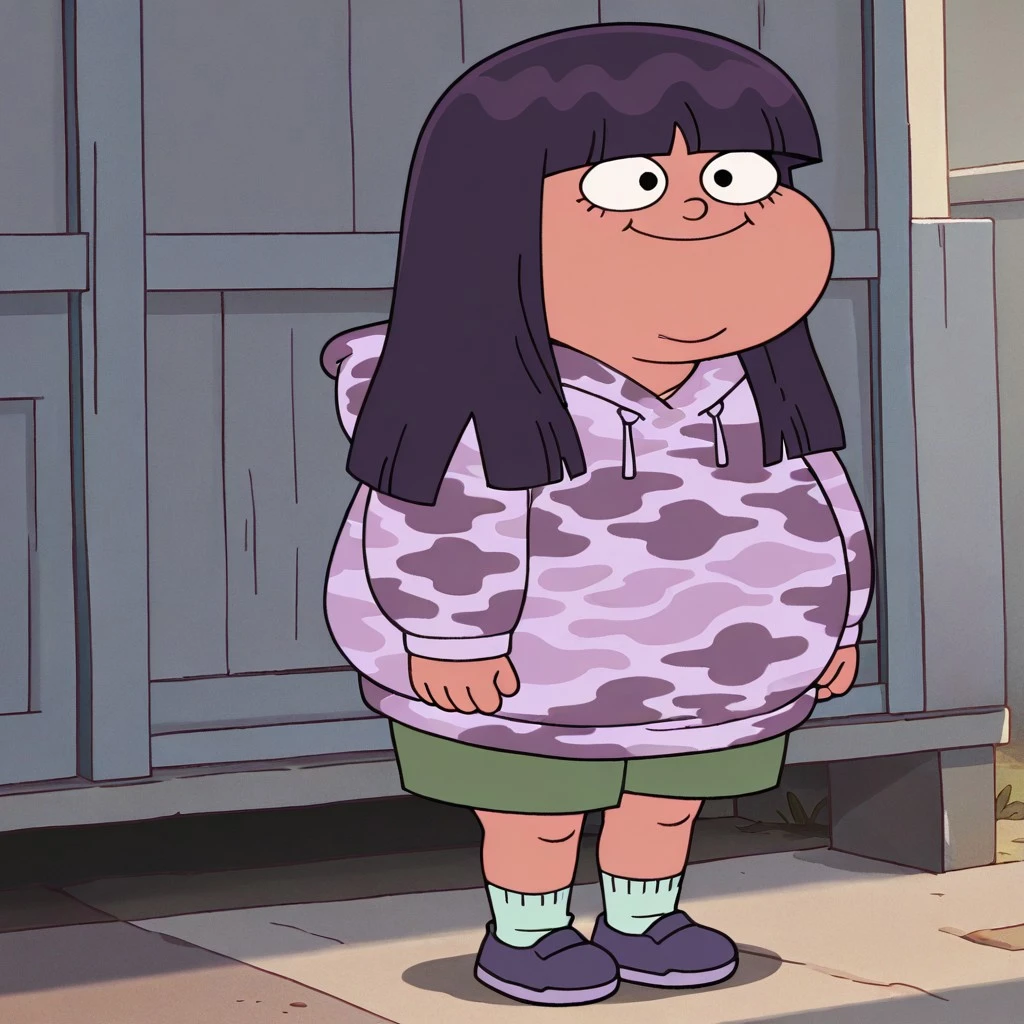 LotLot Ramirez, solo, 1girl, chubby, brown skin, black eyes, long hair, bangs, dark purple hair, purple camo hoodie, green shorts, green and brown socks