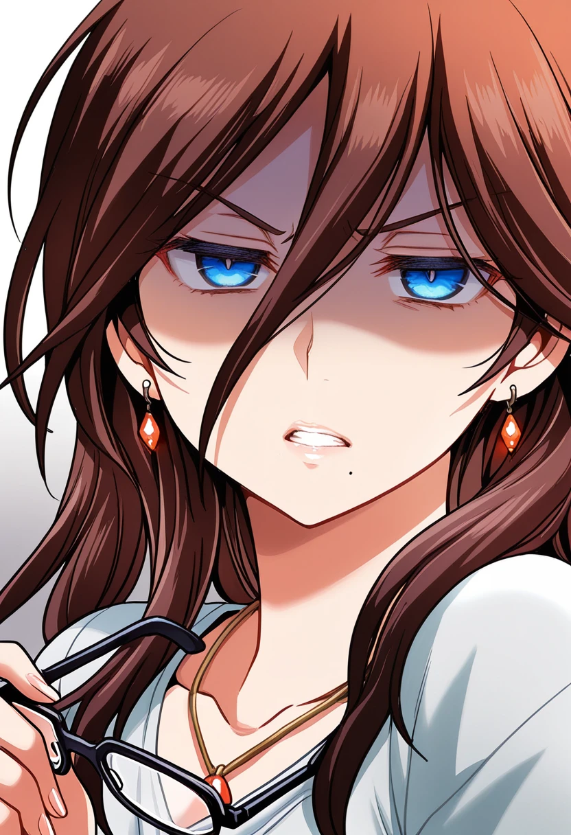 satsuki raimu, 1girl, brown hair, long hair, blue eyes, glasses, mole under mouth, large breasts, shirt, miniskirt, thighhighs, necklace, earrings,