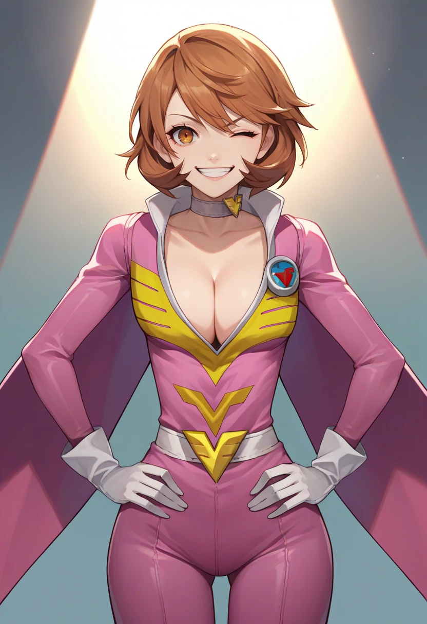 yukariarena, pink bodysuit, white gloves, pink pantyhose, white choker, cleavage