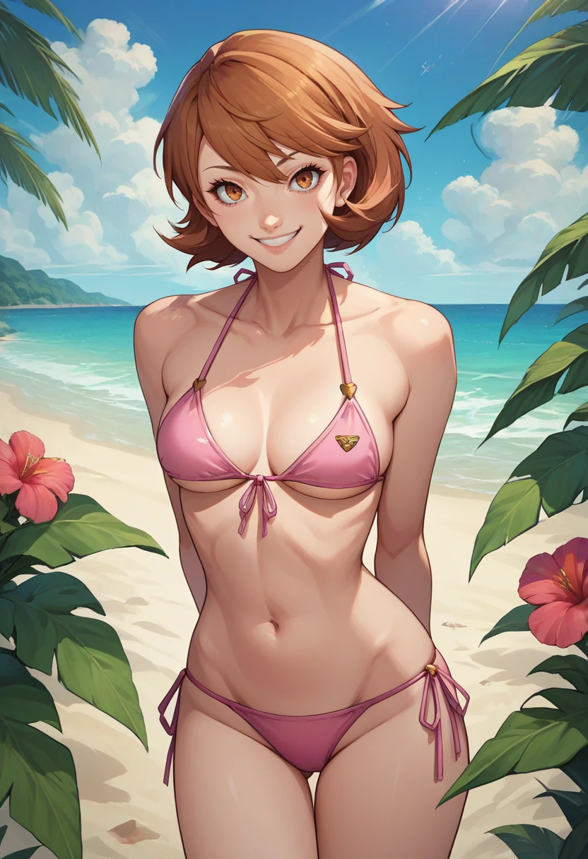 Persona 4 Arena: yukariarena, pink bodysuit, white gloves, pink pantyhose, white choker, cleavage