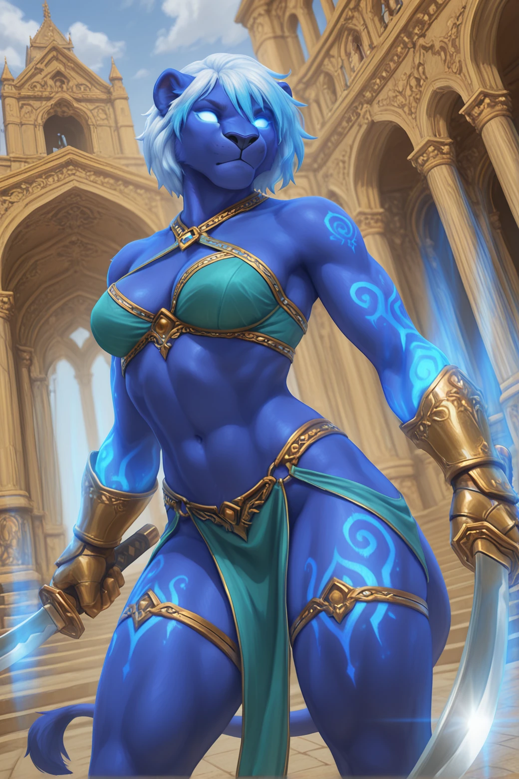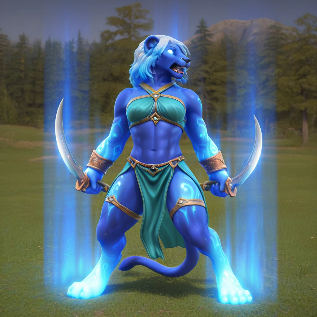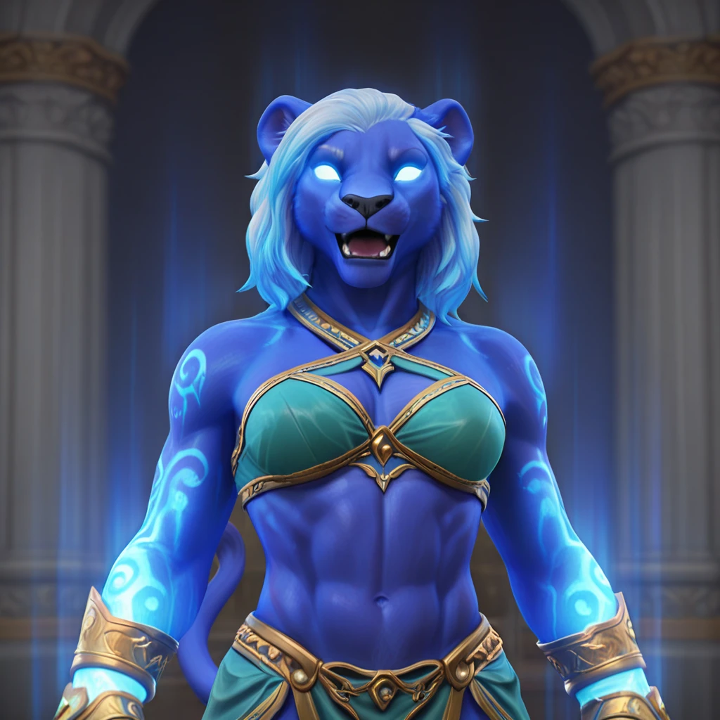 raksh4ssa_fem_h0mmV, anthro, solo, feline, lion, female, solo, blue body, blue fur, white hair, blue highlights, afro, mane, short hair, empty eyes, glowing eyes, black nose, elbow tattoo, thigh tattoo, white tattoo, glowing tattoo, aura, blue glow, magic, medium breasts, athletic female, long bangs, 5 fingers, feline tail