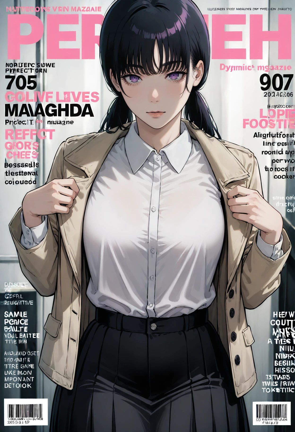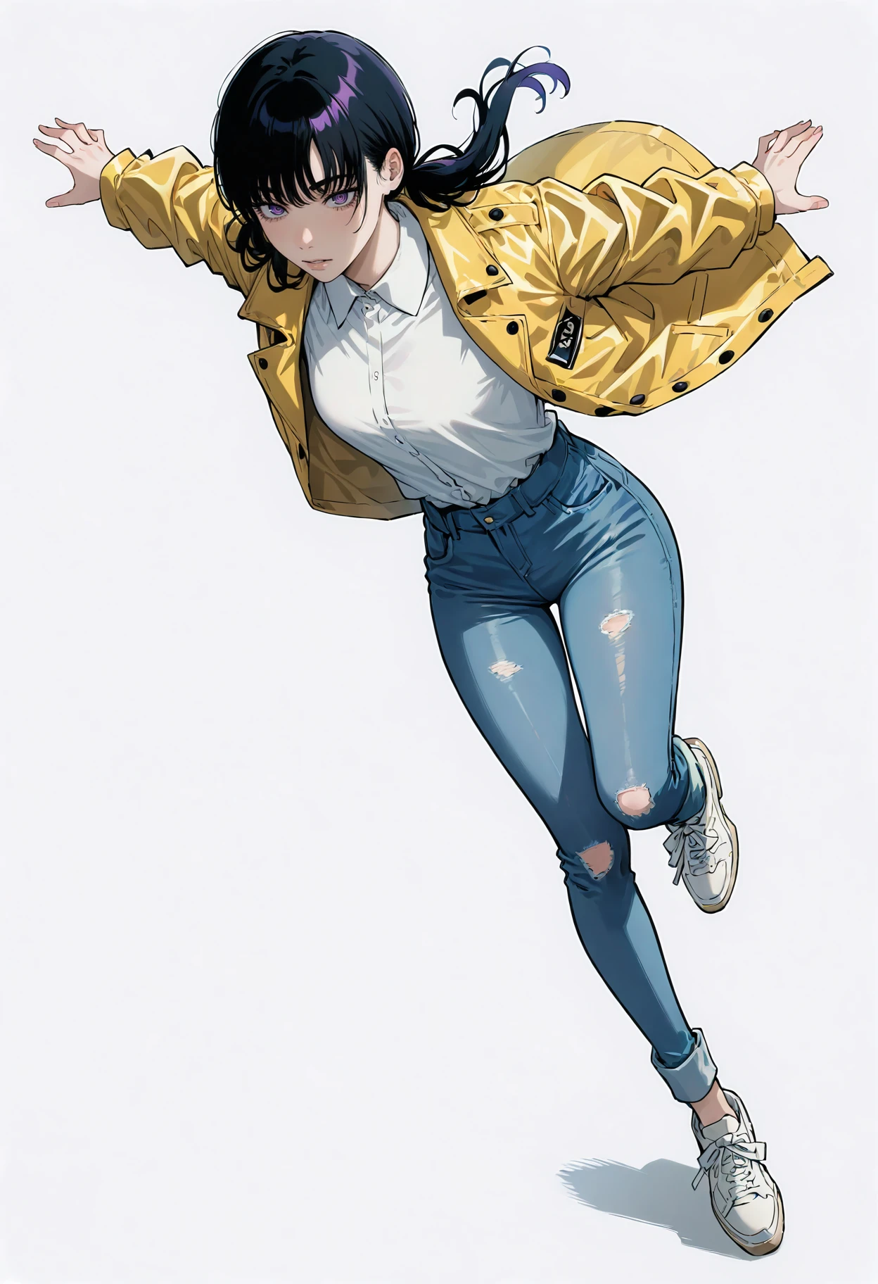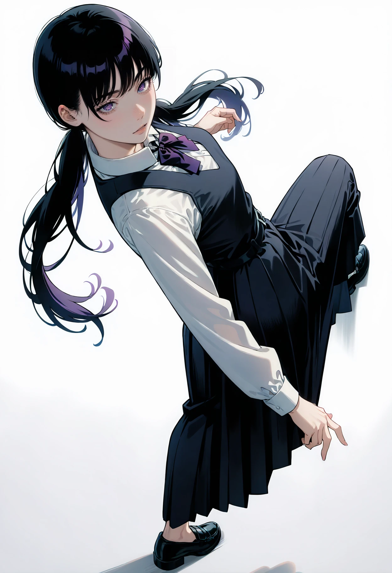 Appearance: 1girl, black hair, ringed eyes, purple eyes, long hair, twintails, bangs, low twintails,
