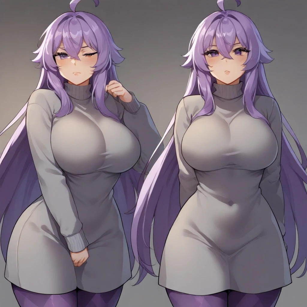 Prompts for her 'default' costume are: black sweater, turtleneck sweater, grey skirt, pleated skirt, purple pantyhose, argyle pantyhose, black boots, lace-up boots