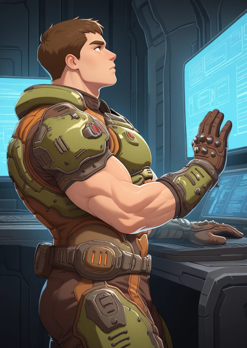 male focus, armor, brown hair, short hair, indoor, sci-fi, brown eyes, cowboy shot, muscular, bara, from side, looking up, holographic computer screen