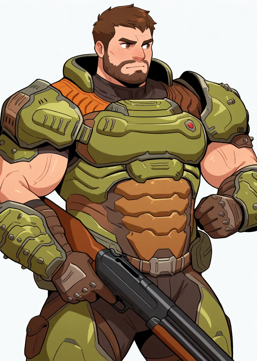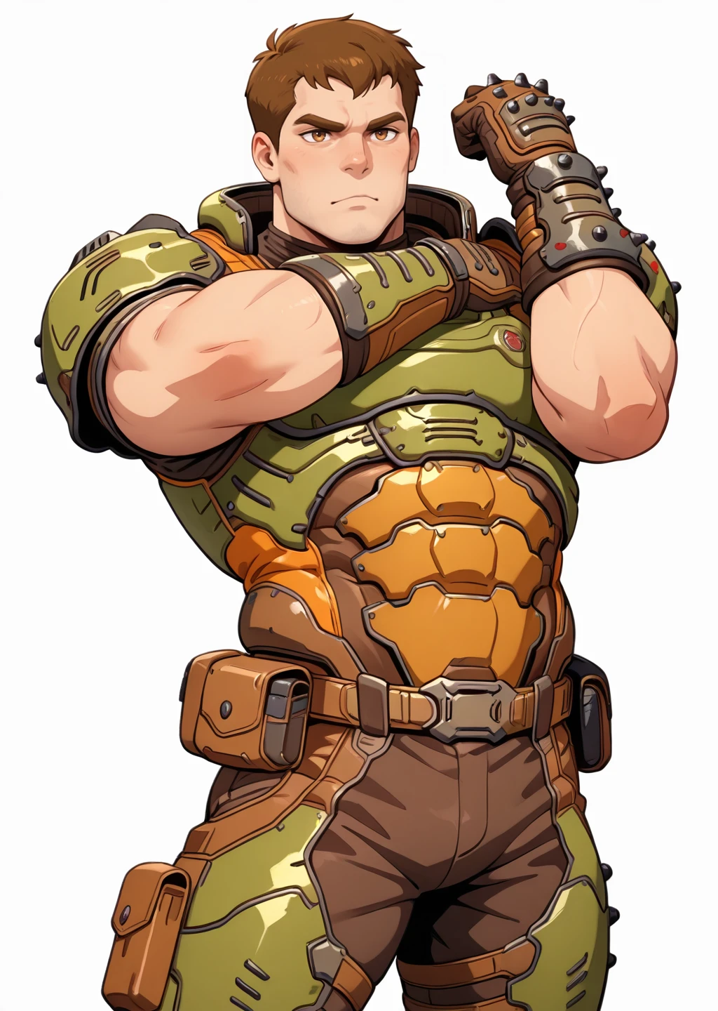 male focus, mature male, man in 40s, helmetlessdoomslayer, armor, muscular, bara, short hair, brown hair, sci-fi setting, brown eyes, pose