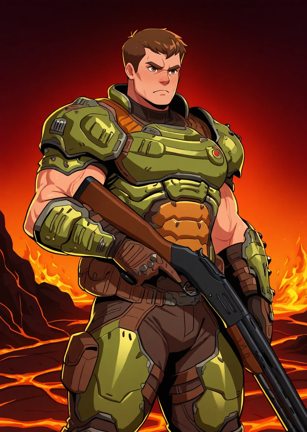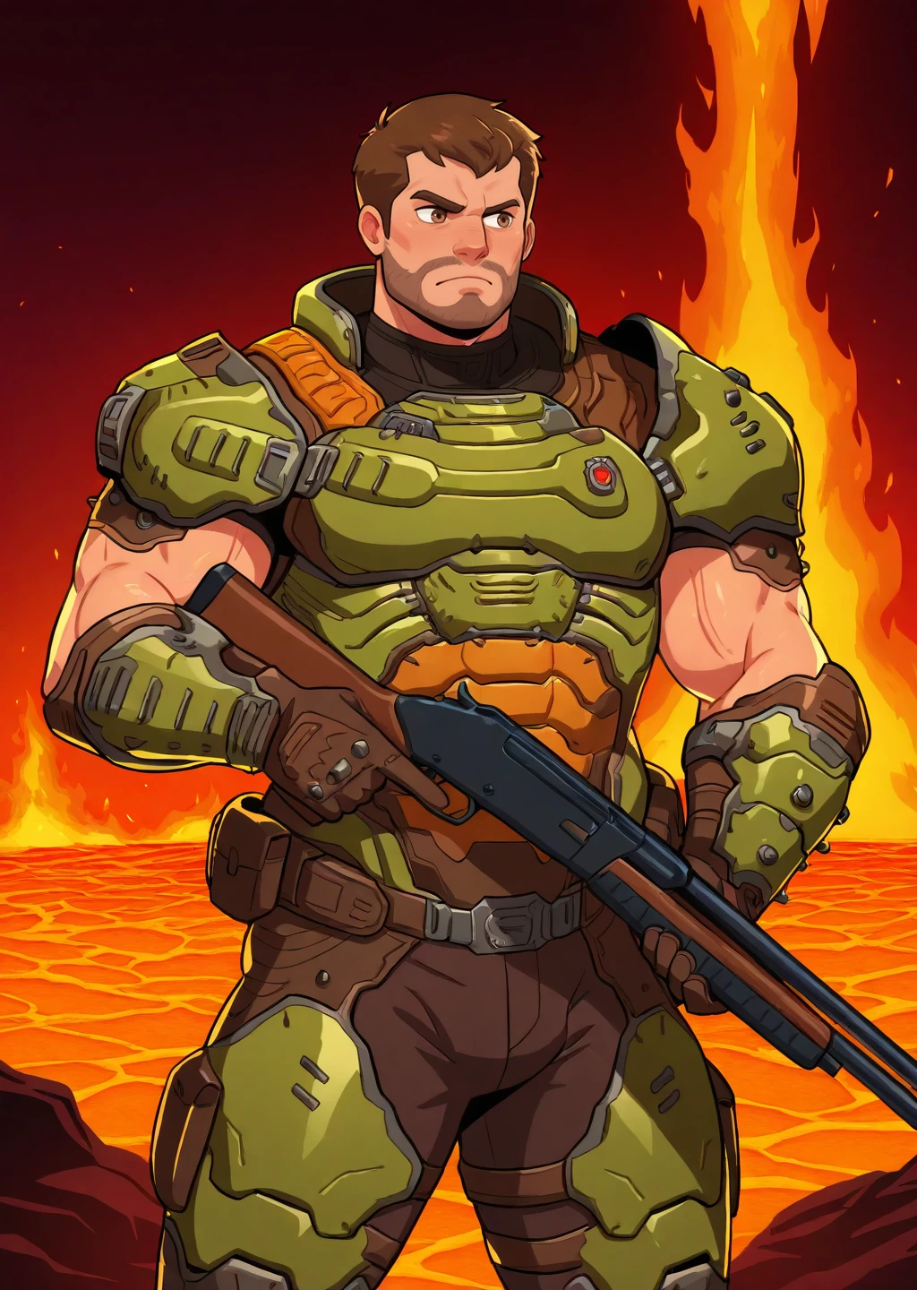 male focus, mature male, man in 40s, wrinkles, helmetlessdoomslayer, armor, muscular, bara, short hair, brown hair, brown eyes, cowboy shot, fair skin, full beard, holding shotgun, shotgun, trigger discipline, hellscape, hell, fire, lava, dramatic, frown, masterpiece, best quality