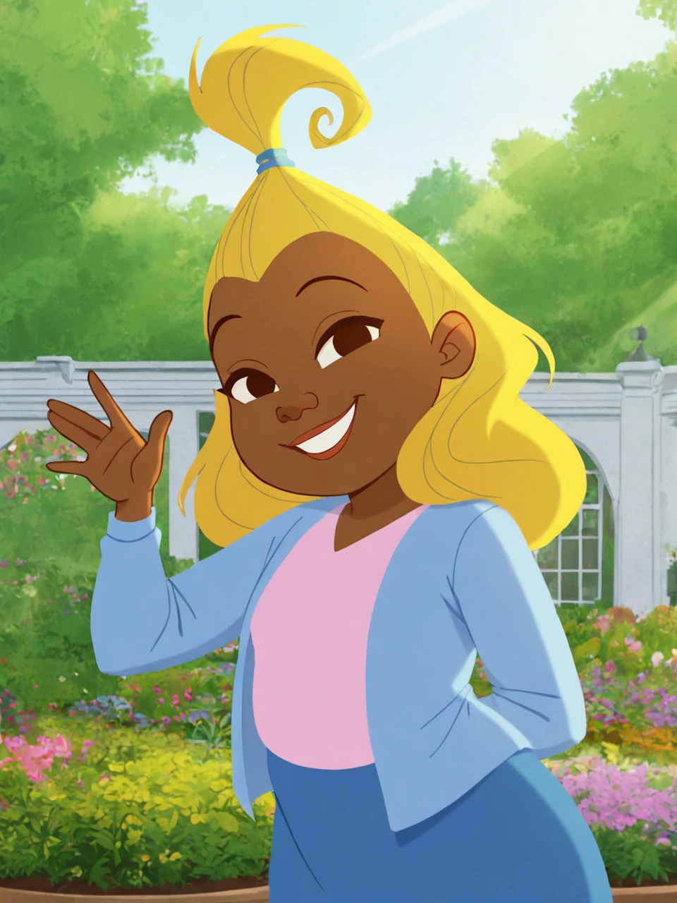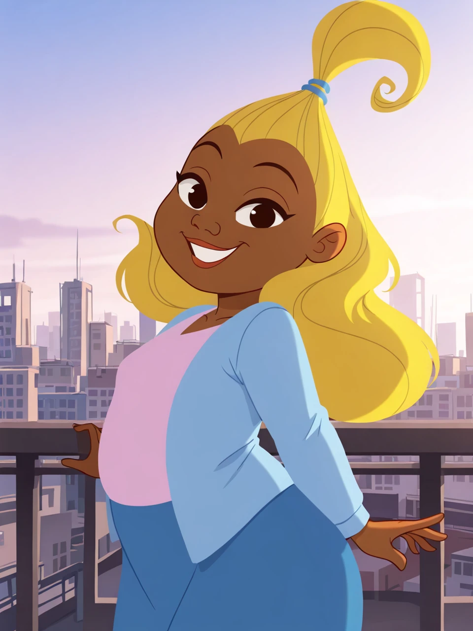 D1j0n4y, 1girl, solo, long hair, blonde hair, topknot, dark-skinned female, pink shirt, blue sweater, blue skirt,