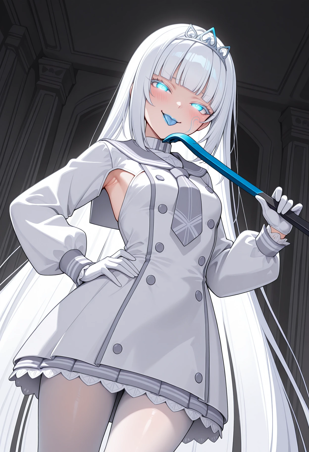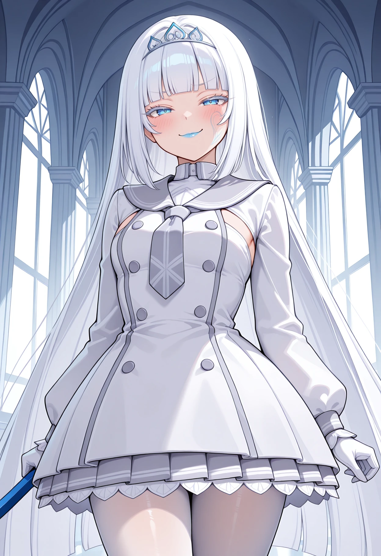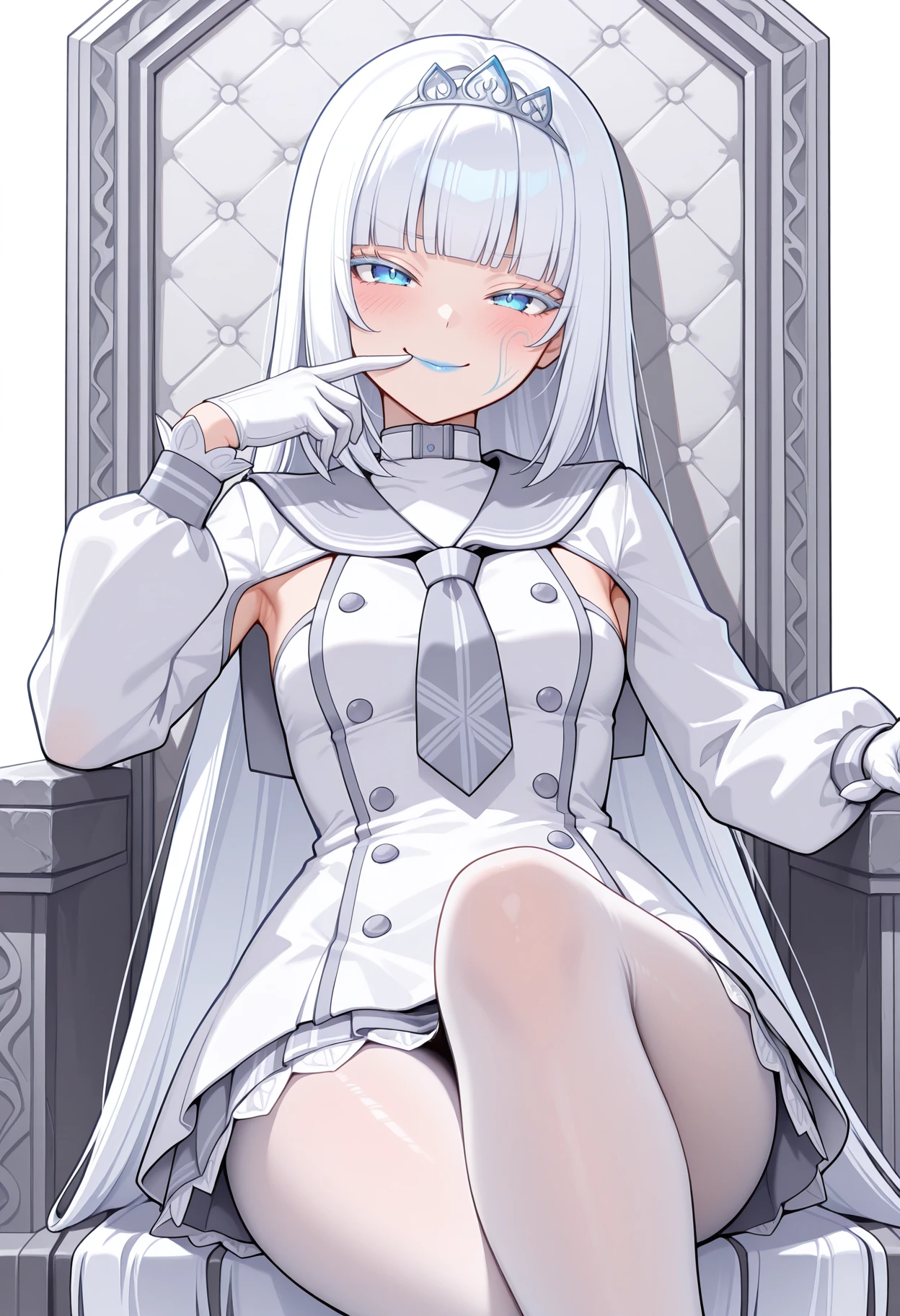 sailor collar, tiara, grey necktie, white dress, armpit cutout, double-breasted, long sleeves, white gloves, grey skirt, white pantyhose, skirt under dress,
