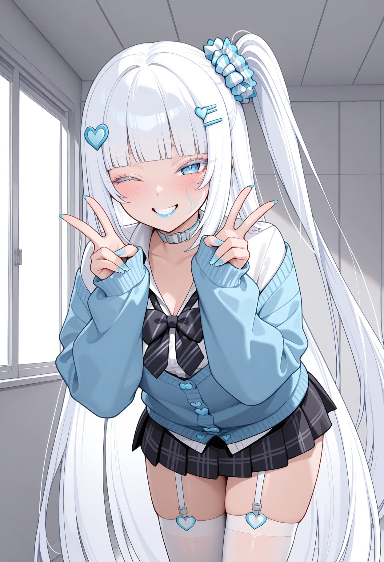 gyaru, one side up, hair bow, hair scrunchie, heart hair ornament, hairclip, choker, blue cardigan, sleeves past wrists, white shirt, black bowtie, striped bowtie, black skirt, plaid skirt, garter straps, white thighhighs, nail polish,