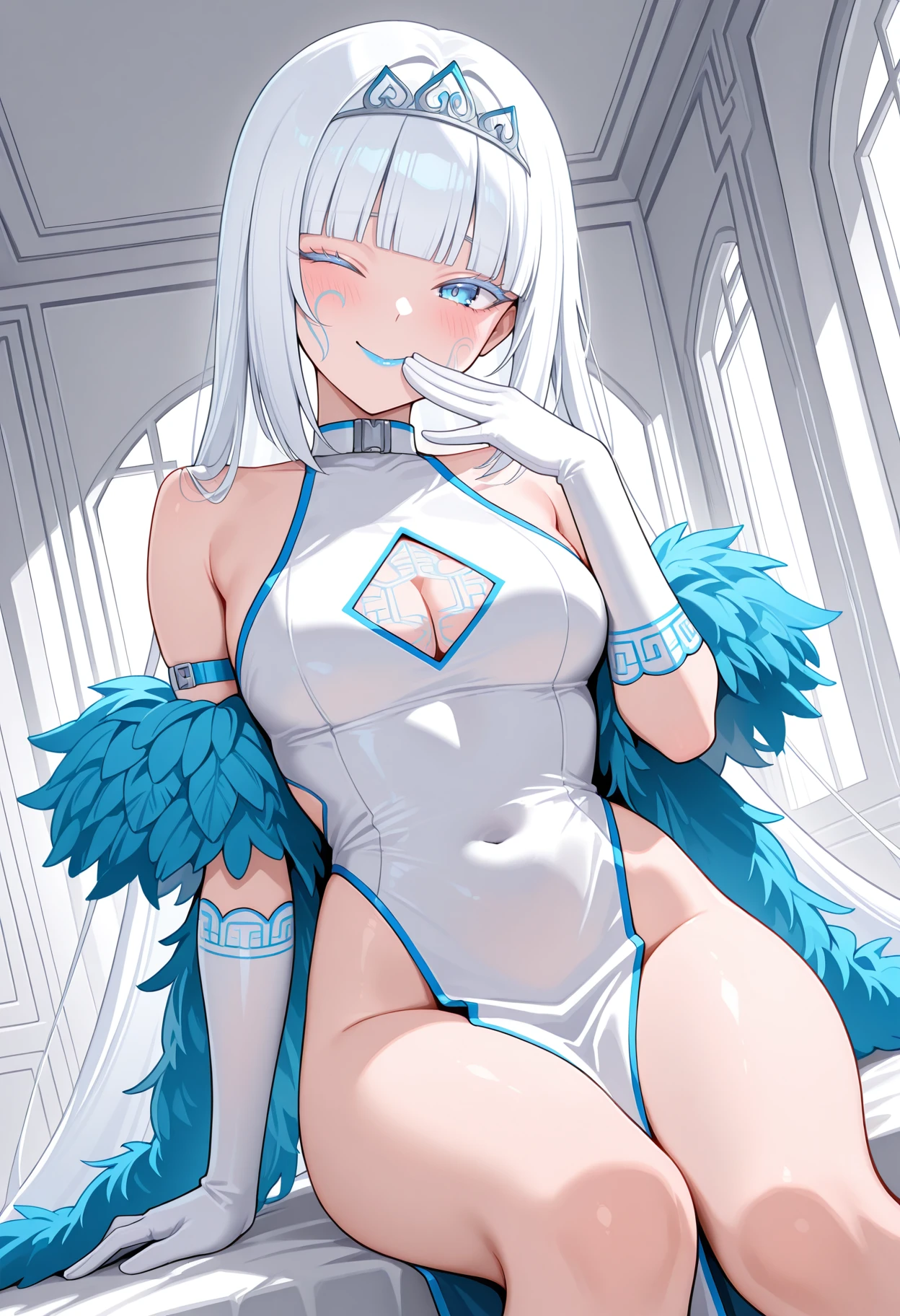 china dress, tiara, crown, halter dress, bare shoulders, cleavage cutout, white dress, blue trim, pelvic curtain, white gloves, elbow gloves, feather boa, light blue shawl,