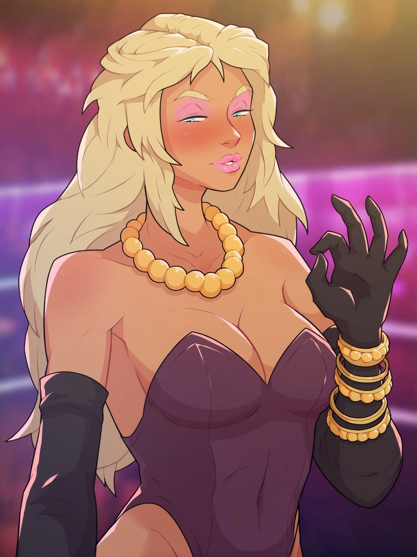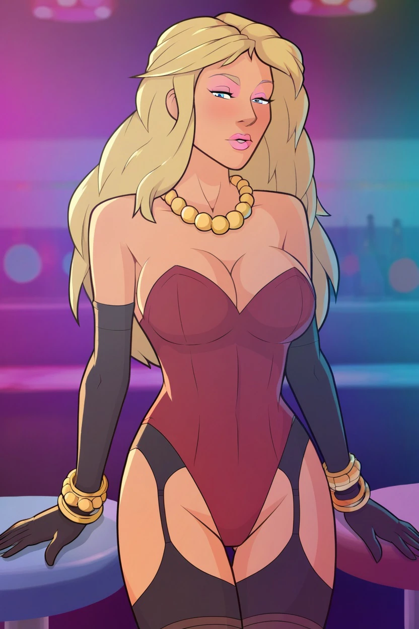 kelsey charms (mnf), long hair, blonde hair, thighhighs, black thighhighs, gloves, elbow gloves, black gloves, cleavage, bare shoulders, blue eyes, half-closed eyes, pink eyeshadow, panties, black panties, garter straps, thighs, necklace, pearl necklace, bracelet, bangle, lips, pink lips, lipstick, eyeshadow
