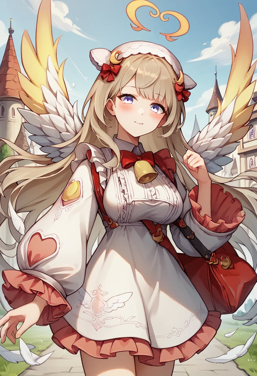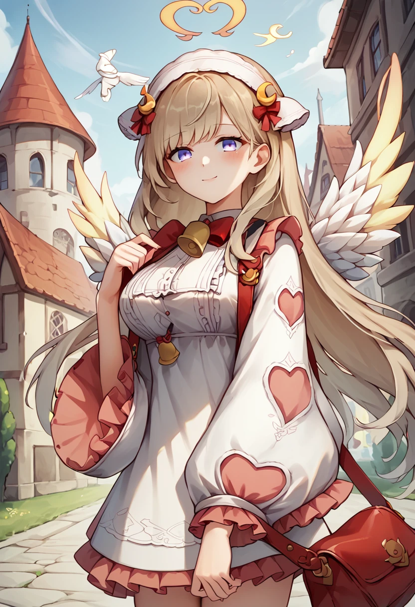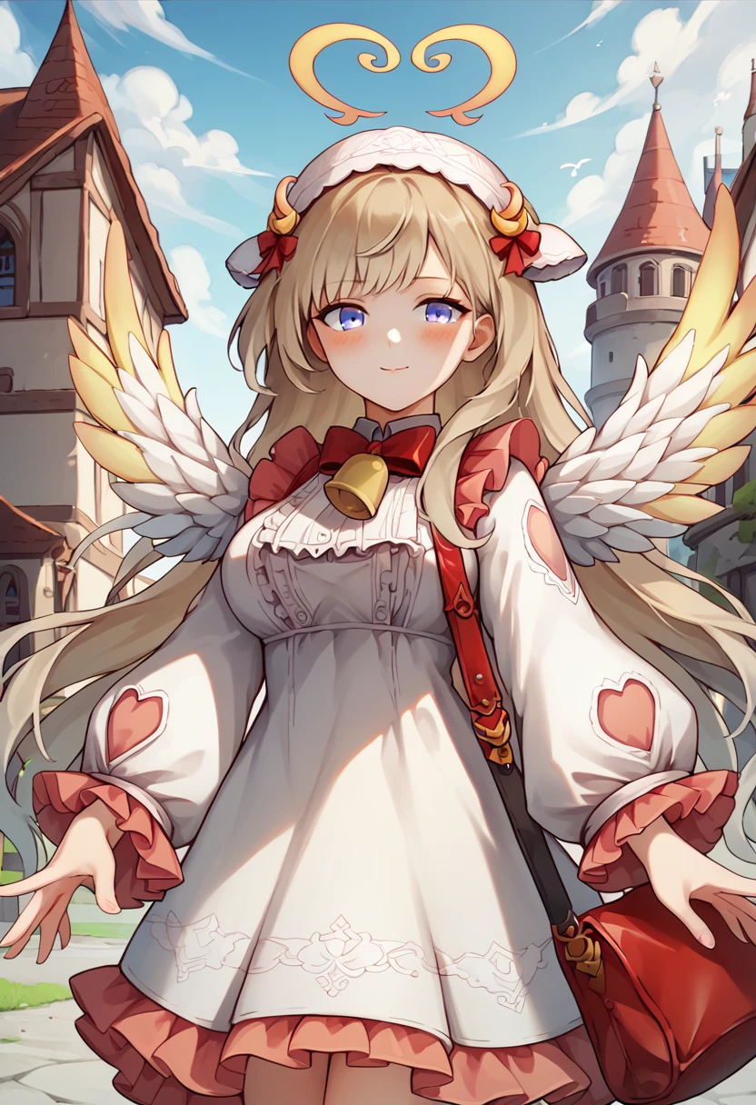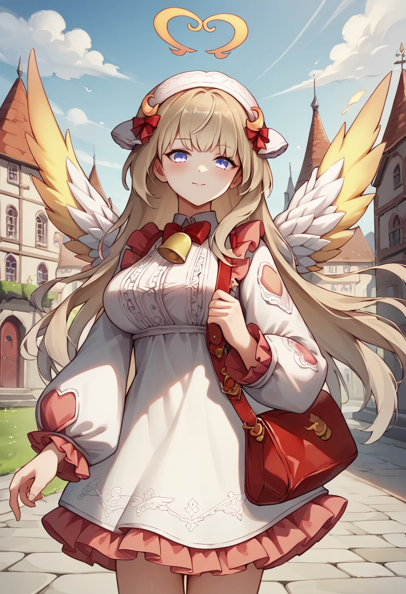 Default Costume: halo, angel wings, white dress, frills, frilled dress, puffy long sleeves, wide sleeves, white headwear, hair ornament, shoulder bag, crescent hat ornament, neck bell, red bow, bow, heart cutout, brown footwear, boots