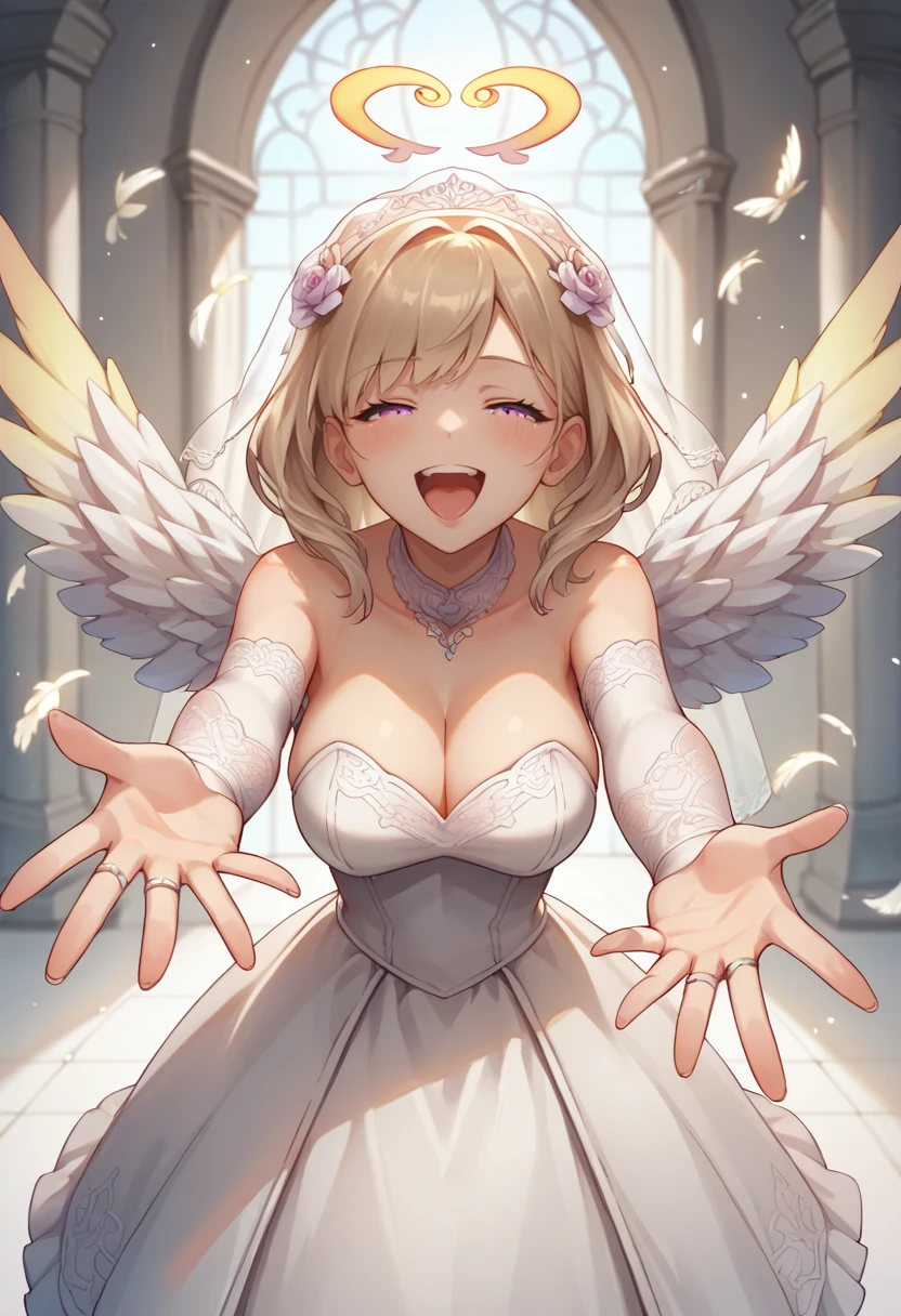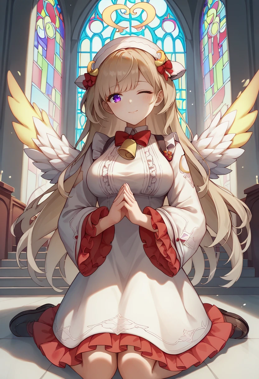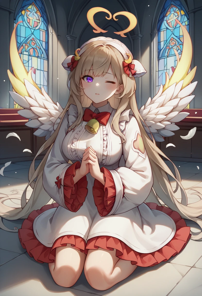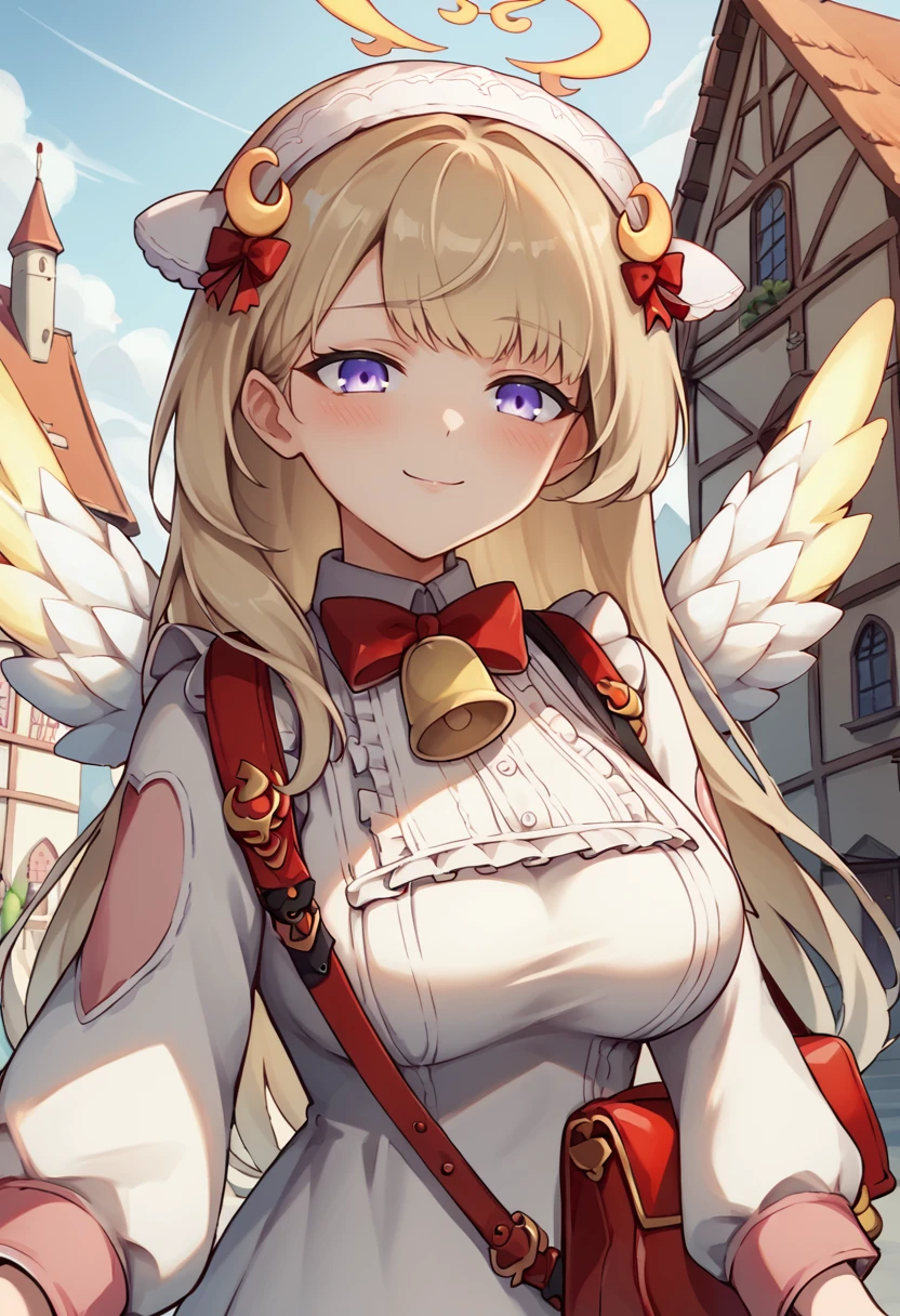Default Costume: halo, angel wings, white dress, frills, frilled dress, puffy long sleeves, wide sleeves, white headwear, hair ornament, shoulder bag, crescent hat ornament, neck bell, red bow, bow, heart cutout, brown footwear, boots