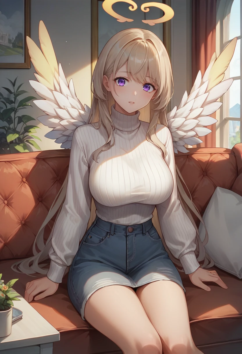 If needed, use blonde hair, purple eyes, long hair, large breasts.