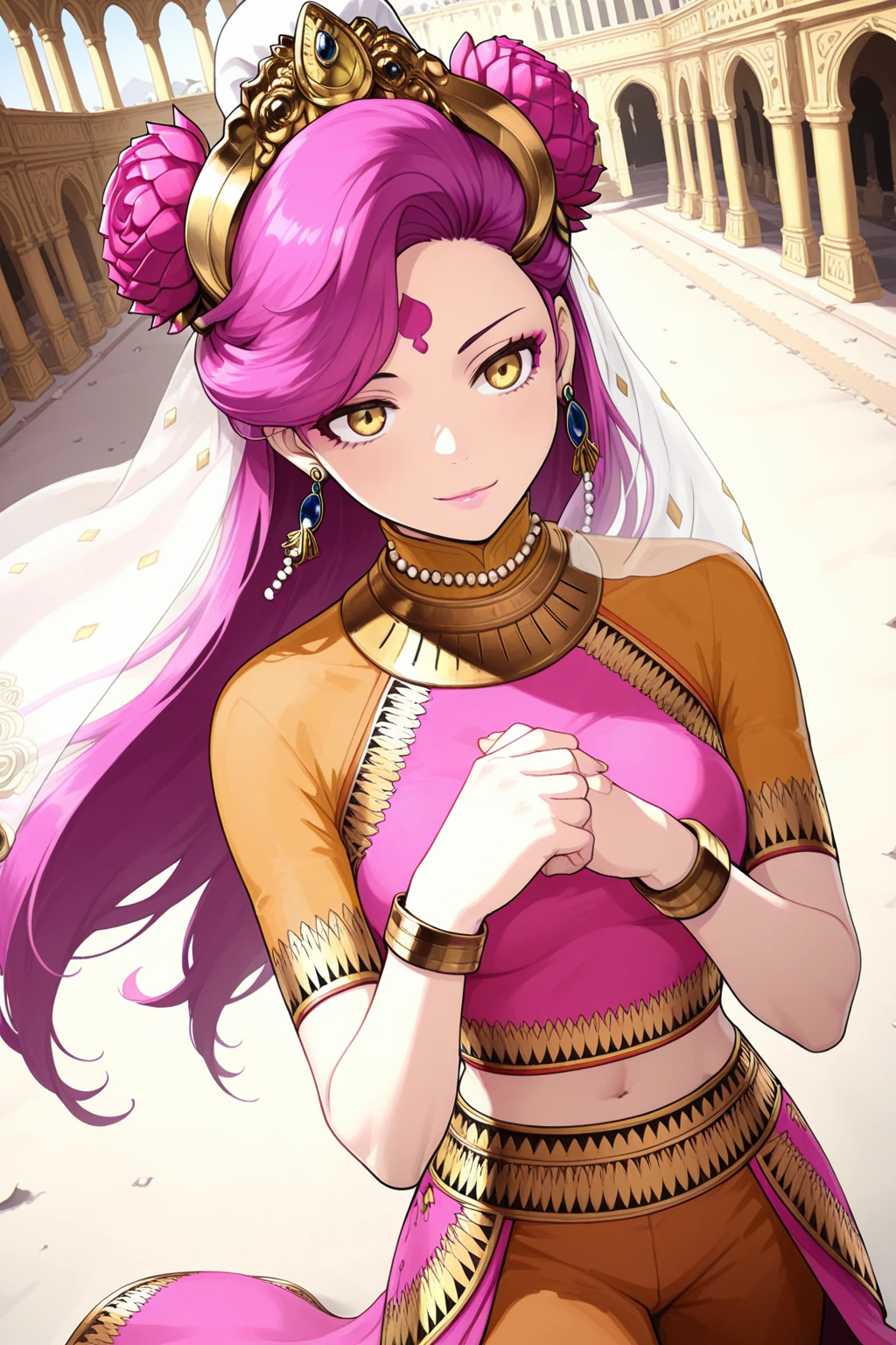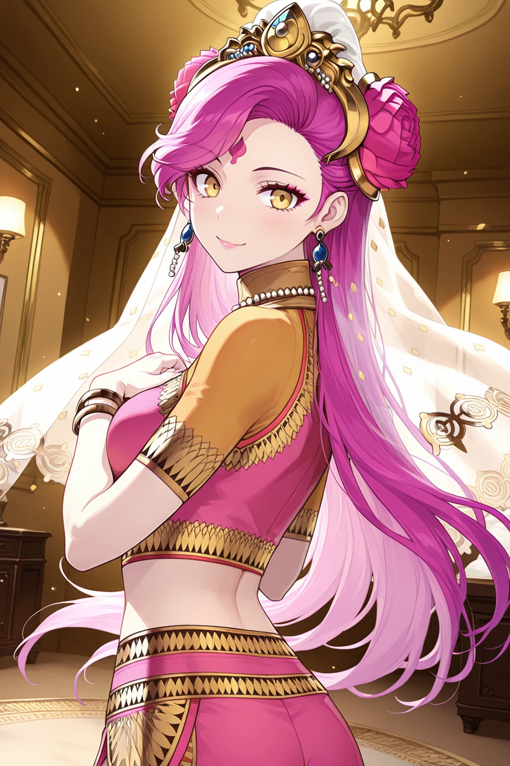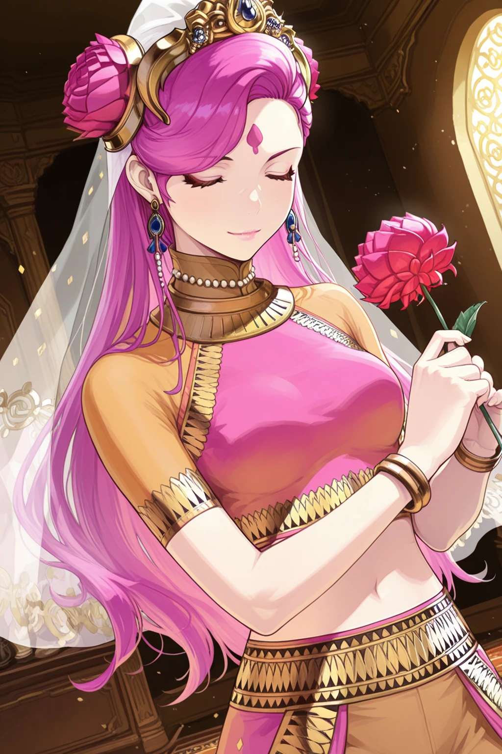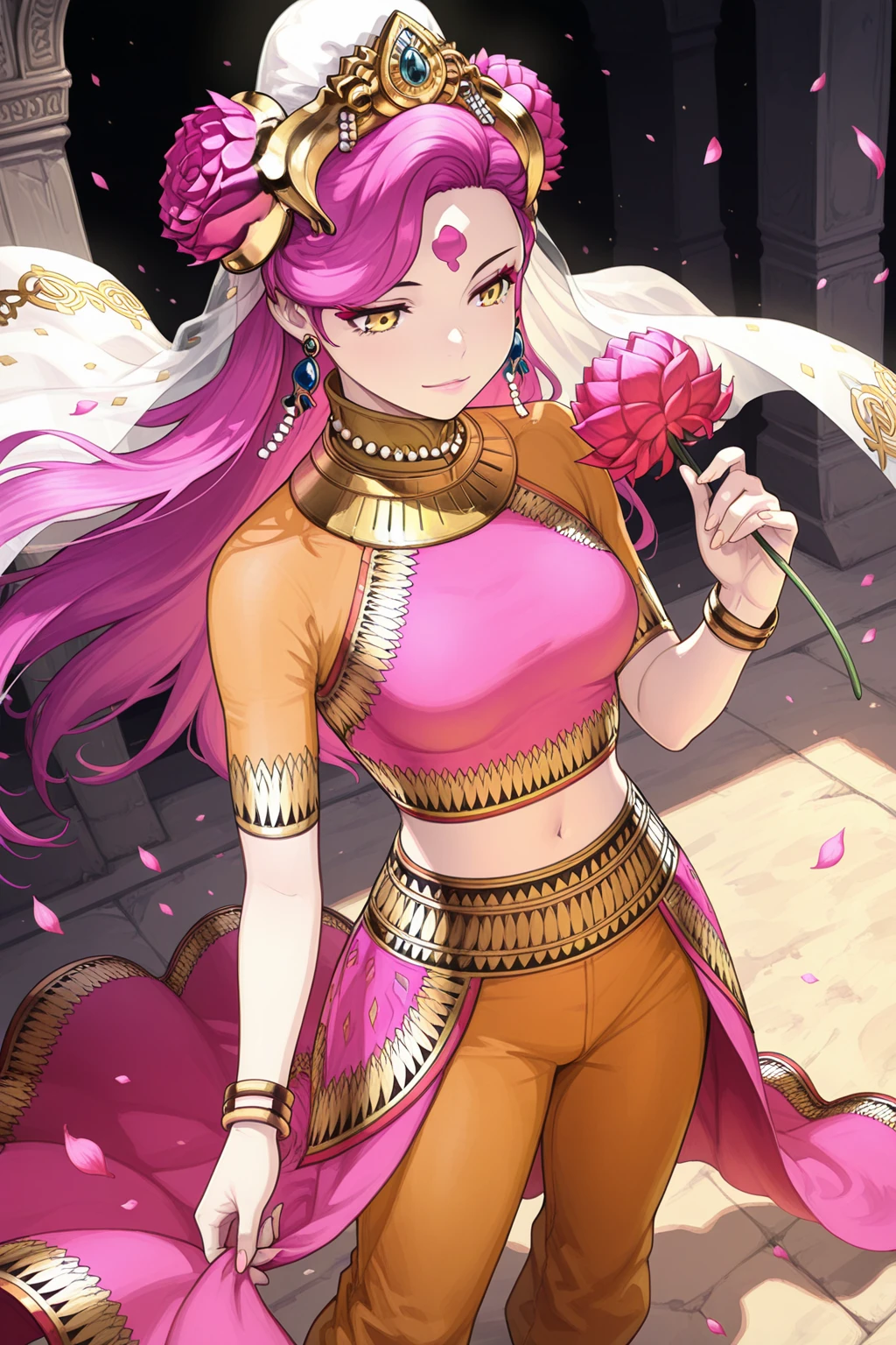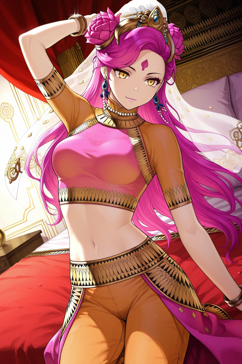 forehead mark, tiara, hair flower, earrings, jewelry, veil, makeup, necklace, crop top, bracelet, midriff, navel, harem pants, barefoot