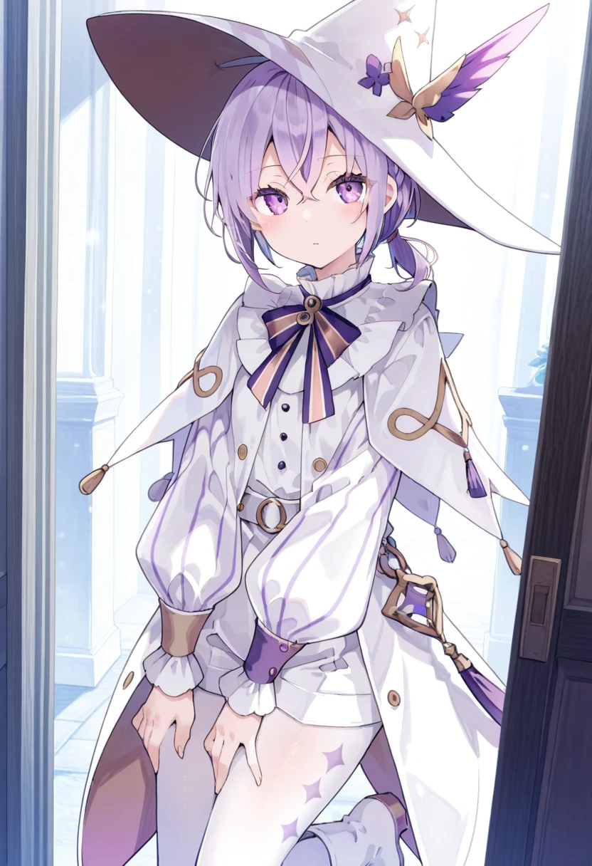 furunshupira(maimai), 1girl, short hair, low ponytail, tied long hair, long sleeves, hair between eyes, purple eyes, white shirt, purple hair, braid, frills, white shorts, white belt, puffy sleeves, single braid, neck ribbon, striped ribbon, purple ribbon, white headwear, witch hat, frilled sleeves, tassel, brooch, hat bow, puffy long sleeves, crossed bangs, frilled shirt collar, white coat, white capelet, sleeve cuffs, white cape, hat feather, vertical-striped sleeves, white belt, buttons, {white thighhighs | white pantyhose| }, white boots, white footwear,