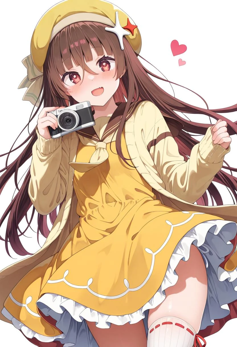 kannoji_nikoru, 1girl, long hair, blush, brown hair, long sleeves, star hat ornament, hat ribbon, diagonal-striped ribbon, yellow dress, yellow sailor dress, yellow beret, hime cut, hair between eyes, brown eyes, frilled dress, open clothes, fang, brown sailor collar, white thighhighs, yellow neckerchief, sleeves past wrists, yellow cardigan, ribbon-trimmed legwear, open cardigan, heart in eye, holding camera, heart in eye, uneven legwear, over-kneehighs,
