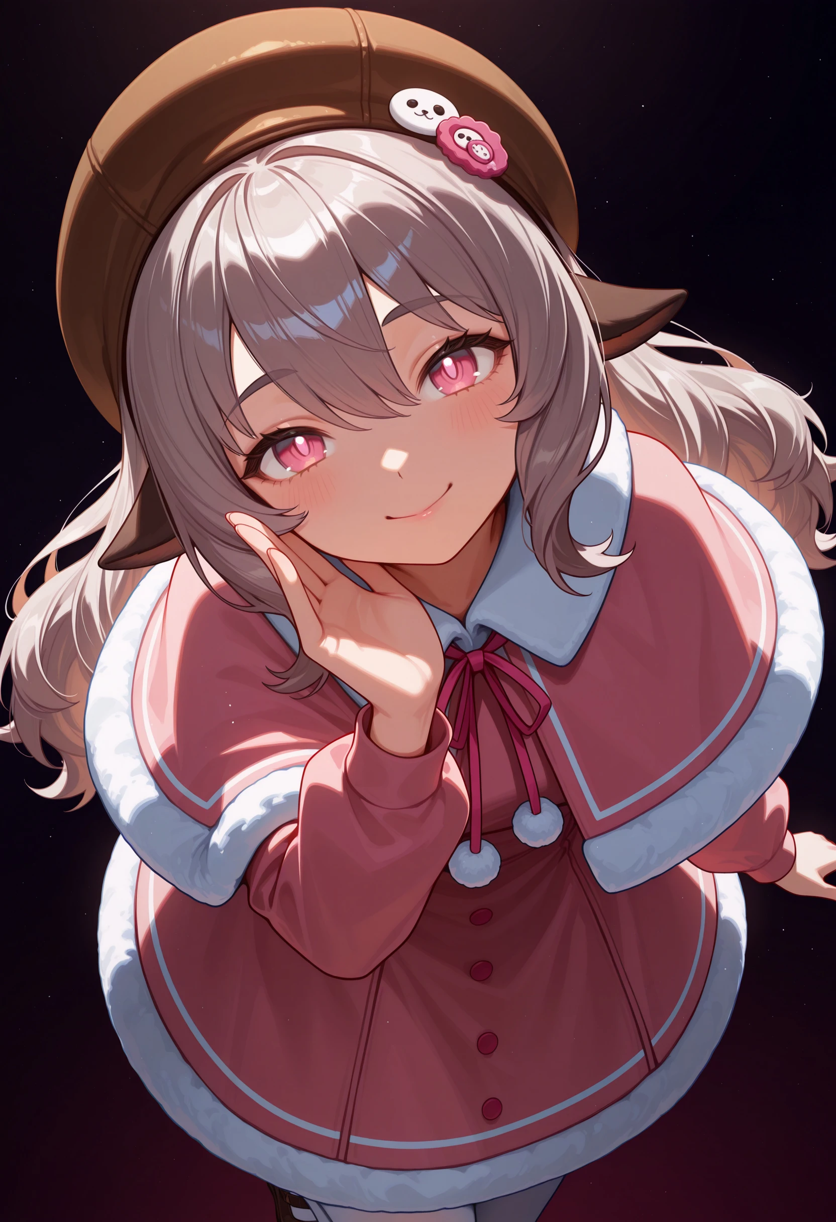 essieclas, sheep girl, sheep ears, fluffy hair, light gray hair, light pink eyes, beret, fur-trimmed capelet, pink capelet, pink fur-trimmed dress, hair between eyes, bright pupils, white pantyhose, hat ornament, brown mary janesDescription