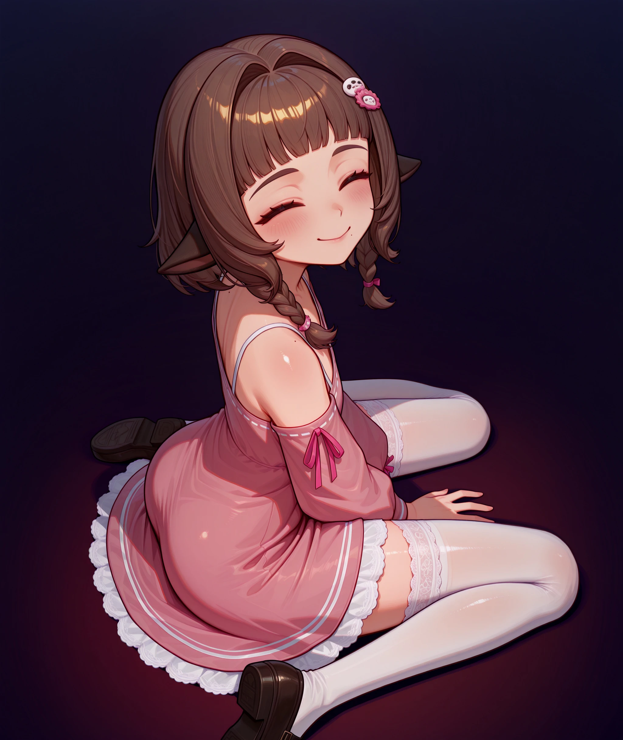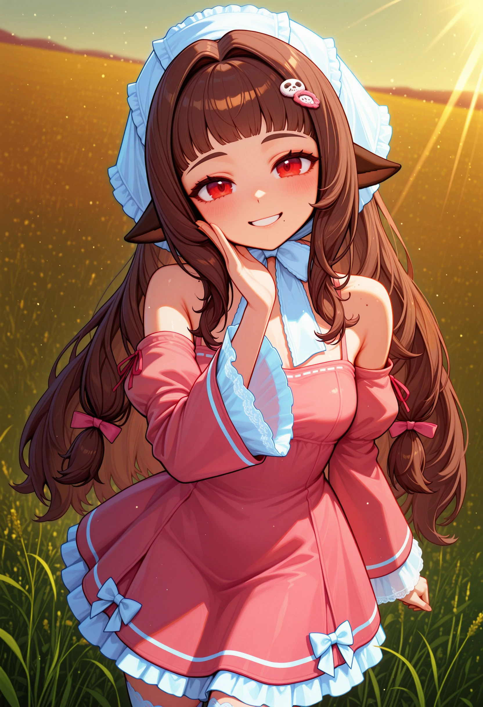 essiech, sheep girl, sheep ears, long hair, brown hair, blunt bangs, hair intakes, bonnet, tress ribbon, blunt tresses, hair ornament, red eyes, bonnet, large white bow, mole under mouth, mole on neck, mole on shoulder, bare shoulders, pink dress, pink spaghetti straps, off-shoulder dress, sleeve ribbon, lace-trimmed sleeves, white lace-trimmed thighhighs, wide sleeves, black mary janestwin braids, short sidelocks, short hairWorth noting that the mole on neck tag is best avoided when generating her with the bonnet + large white bow, as these two end up covering her entire neck and will probably cause the AI to try finding a gap to generate the mole in, which might yield unwanted results.
