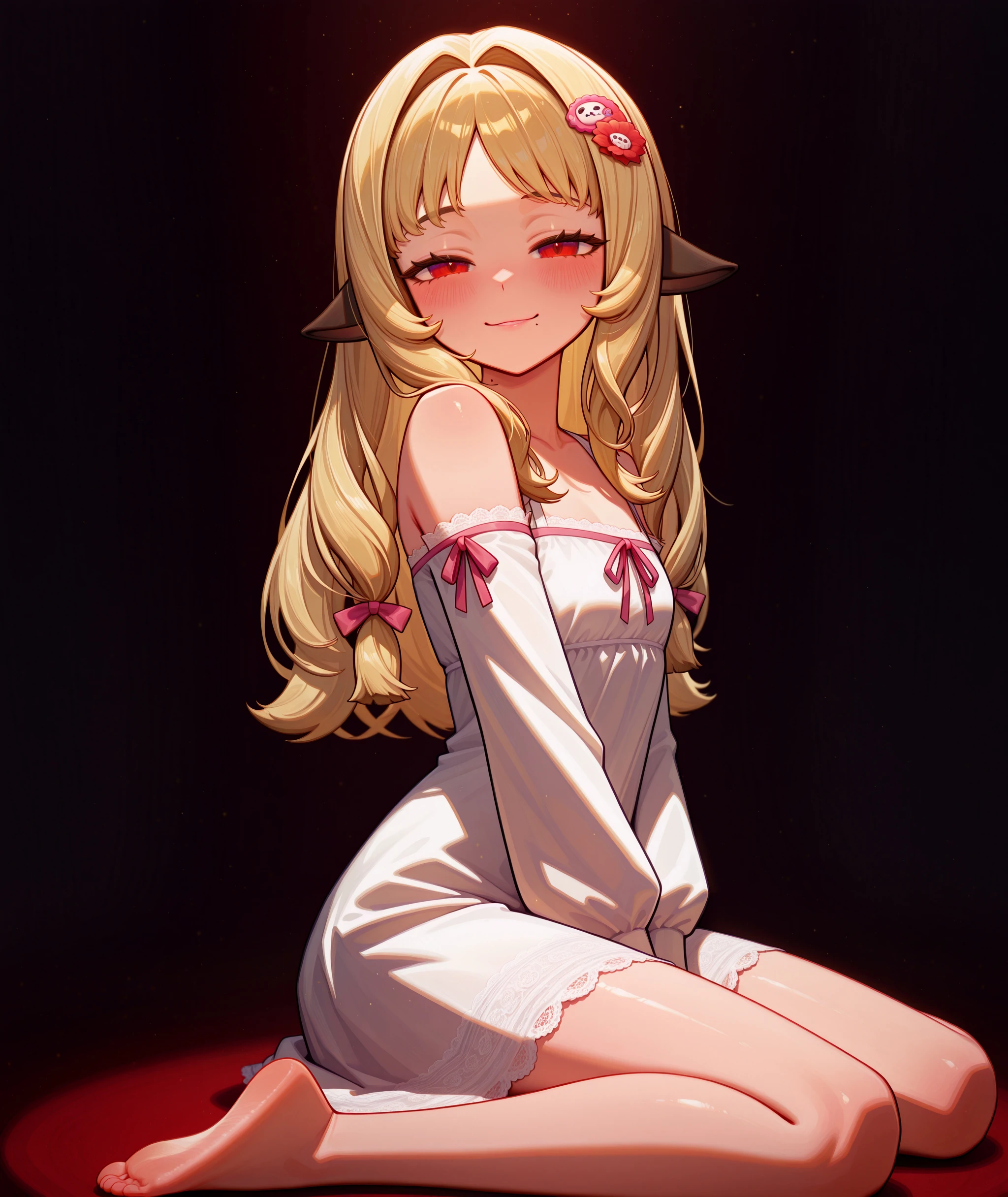 essiegyr, sheep girl, sheep ears, blond hair, red eyes, parted bangs, choppy bangs, hair intakes, long hair, tress ribbon, blunt tresses, hair ornament, red eyes, mole under mouth, mole on neck, mole on shoulder, off-shoulder dress, bare shoulders, white lace-trimmed dress, long sleeves, hair flower, red flowerOld design: