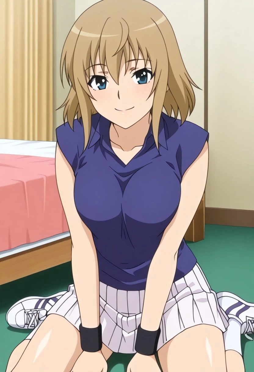 haruka ichinose ep2 tennis outfit, tennis uniform, sleeveless shirt, collared shirt, blue shirt, wristband, white skirt, pleated skirt, white socks, sneakers,