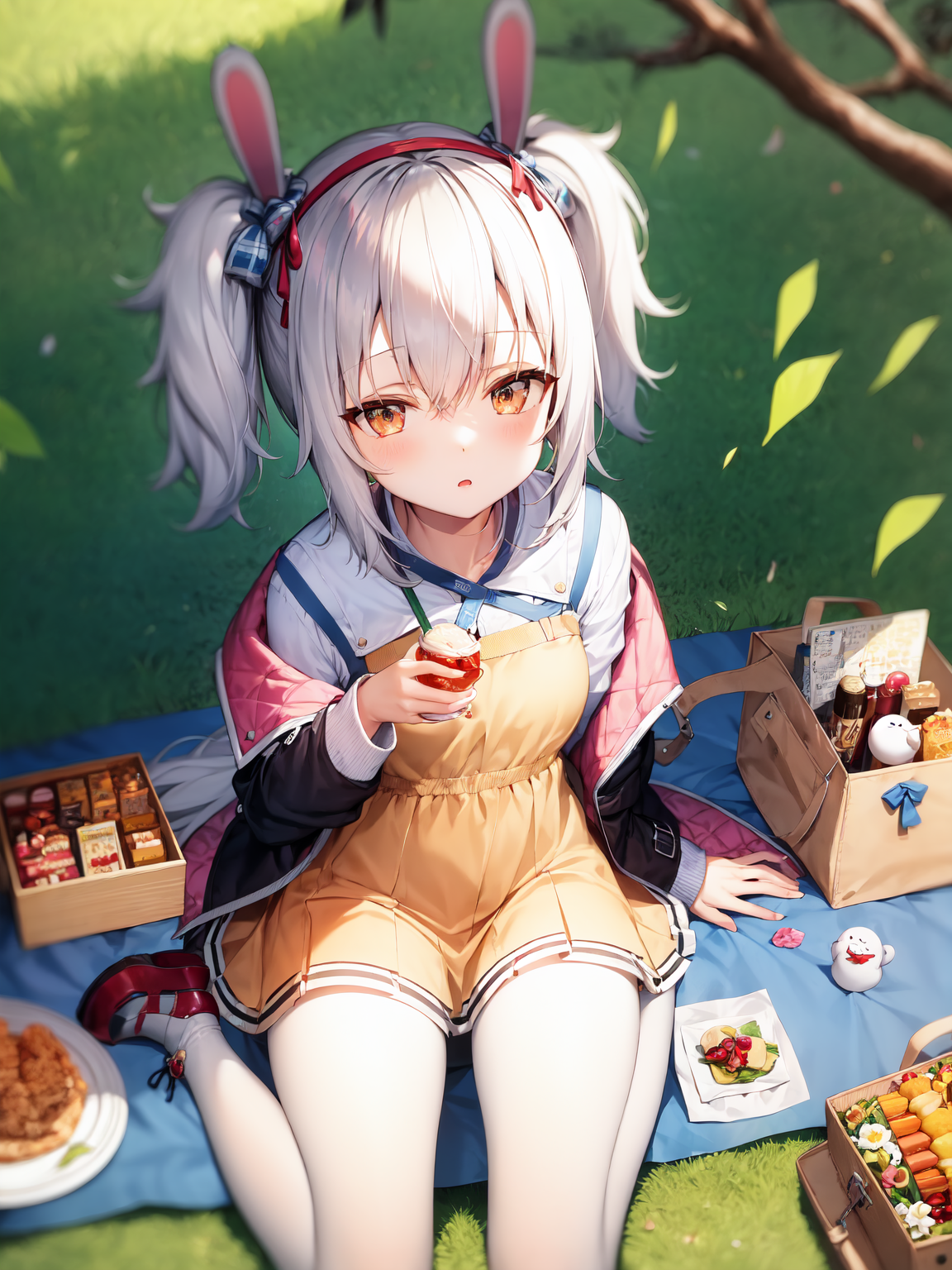 school_uniform, fake animal ears, navel, hat,7.Picnic Adventure?