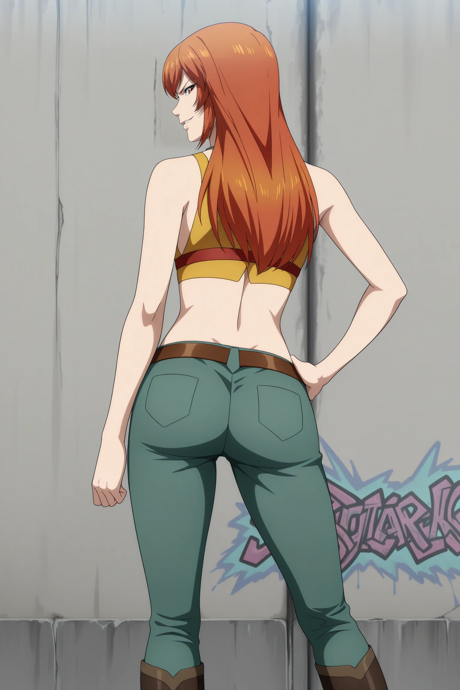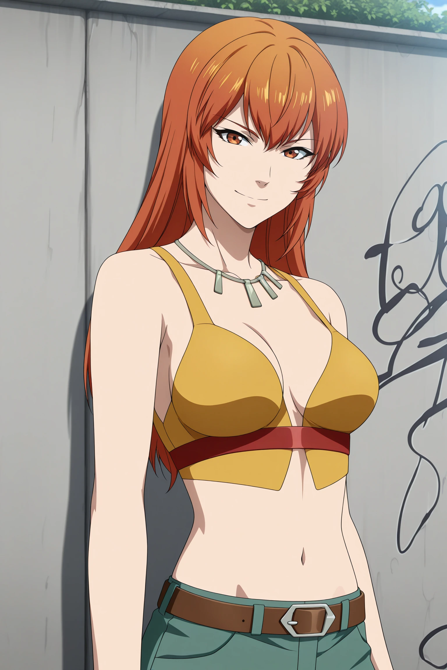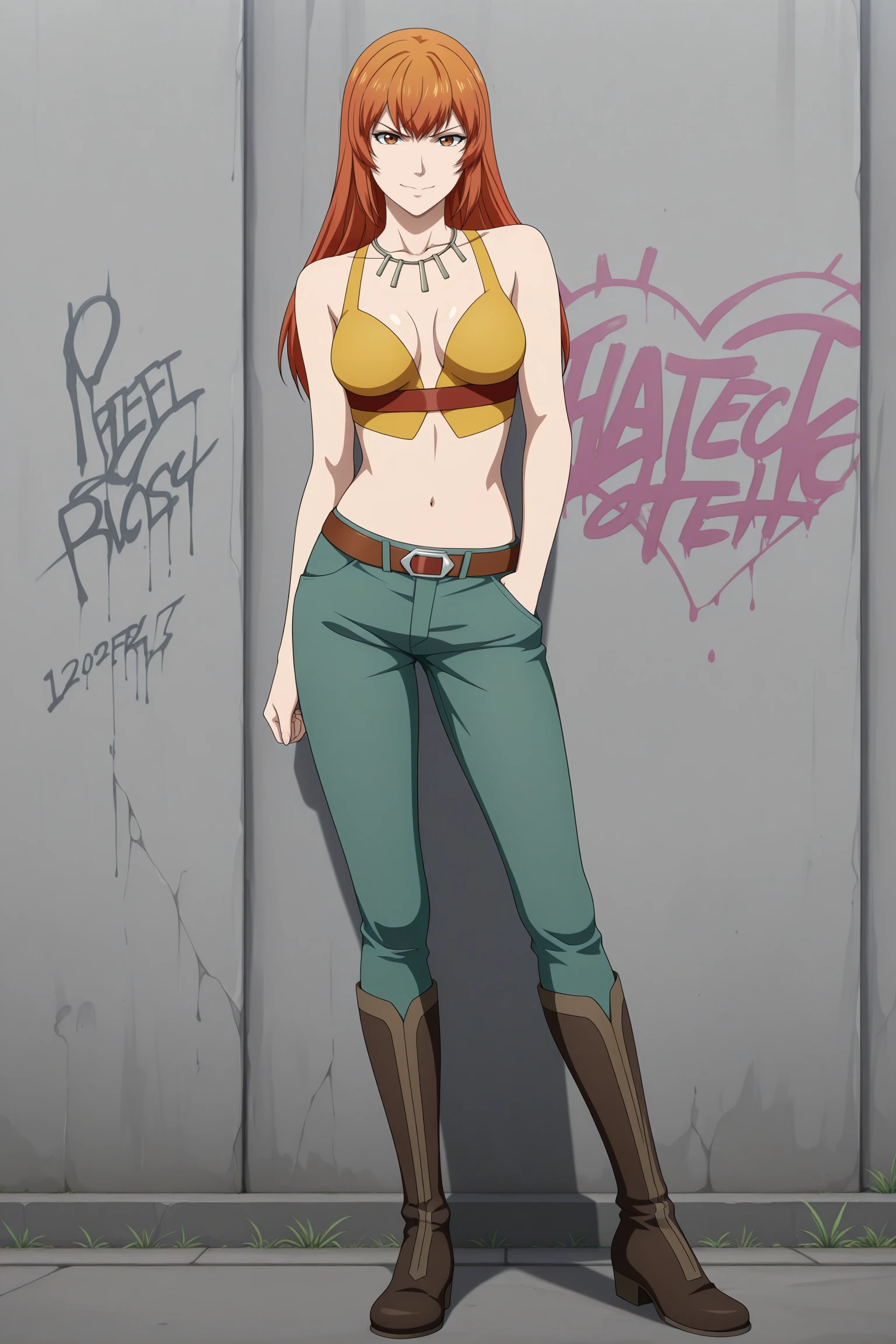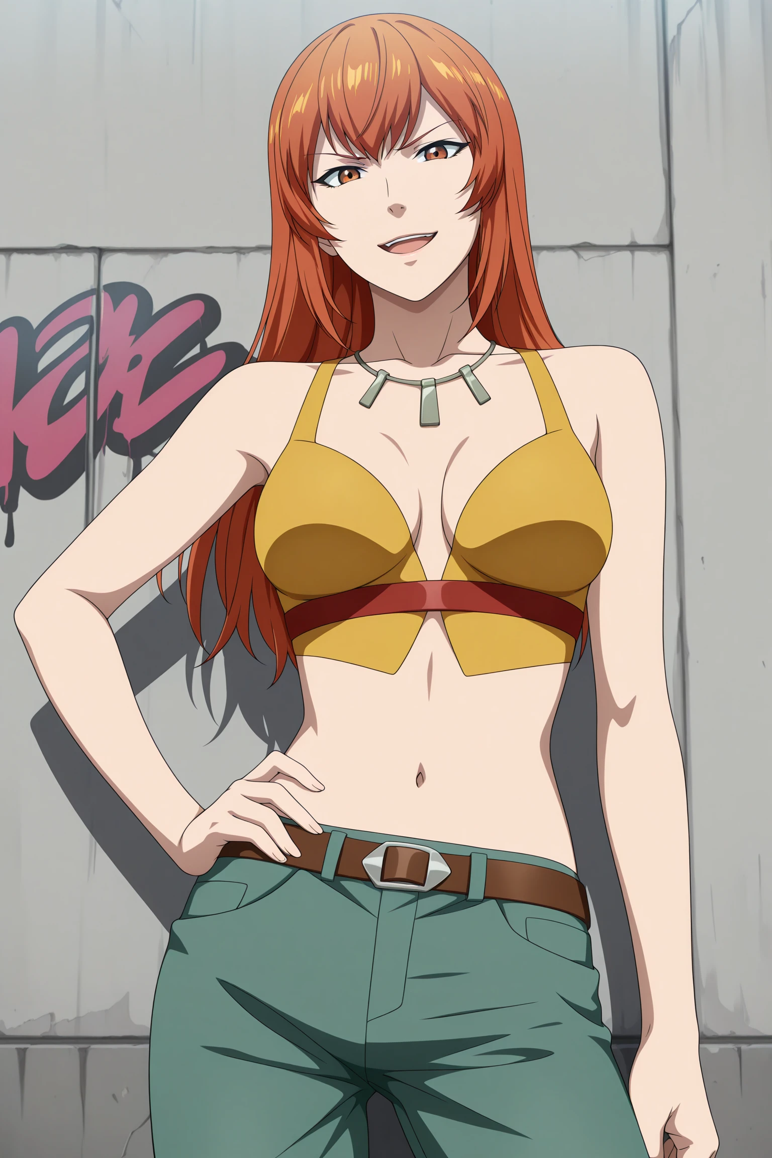 joy, long hair, orange hair, double-parted bangs, orange eyes, necklace, crop top, yellow shirt, underbust, belt, green pants, brown footwear, knee bootsOPTIONAL WORDS