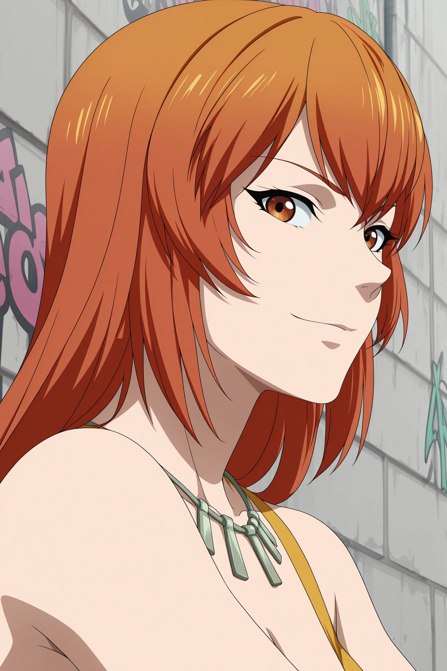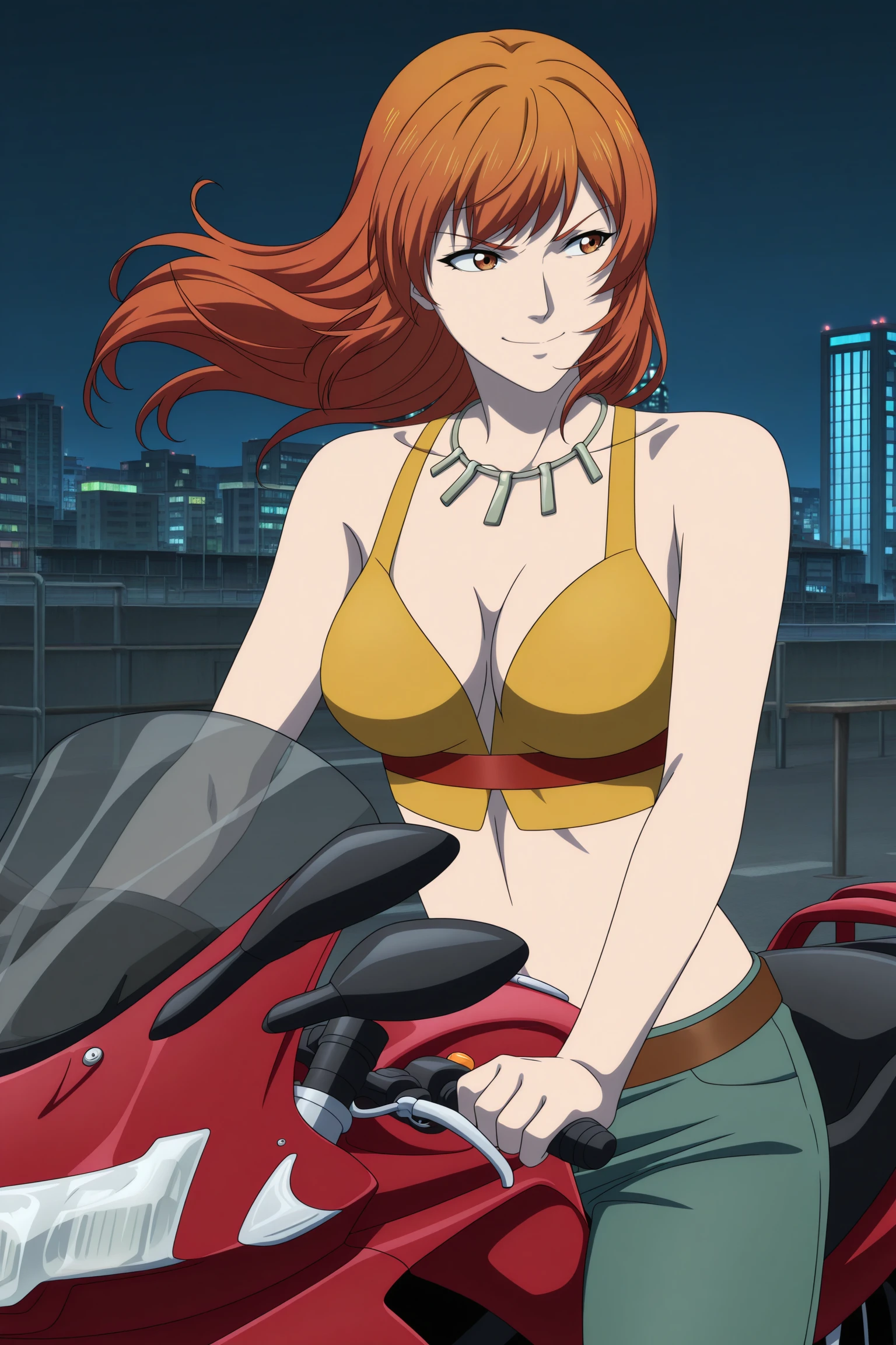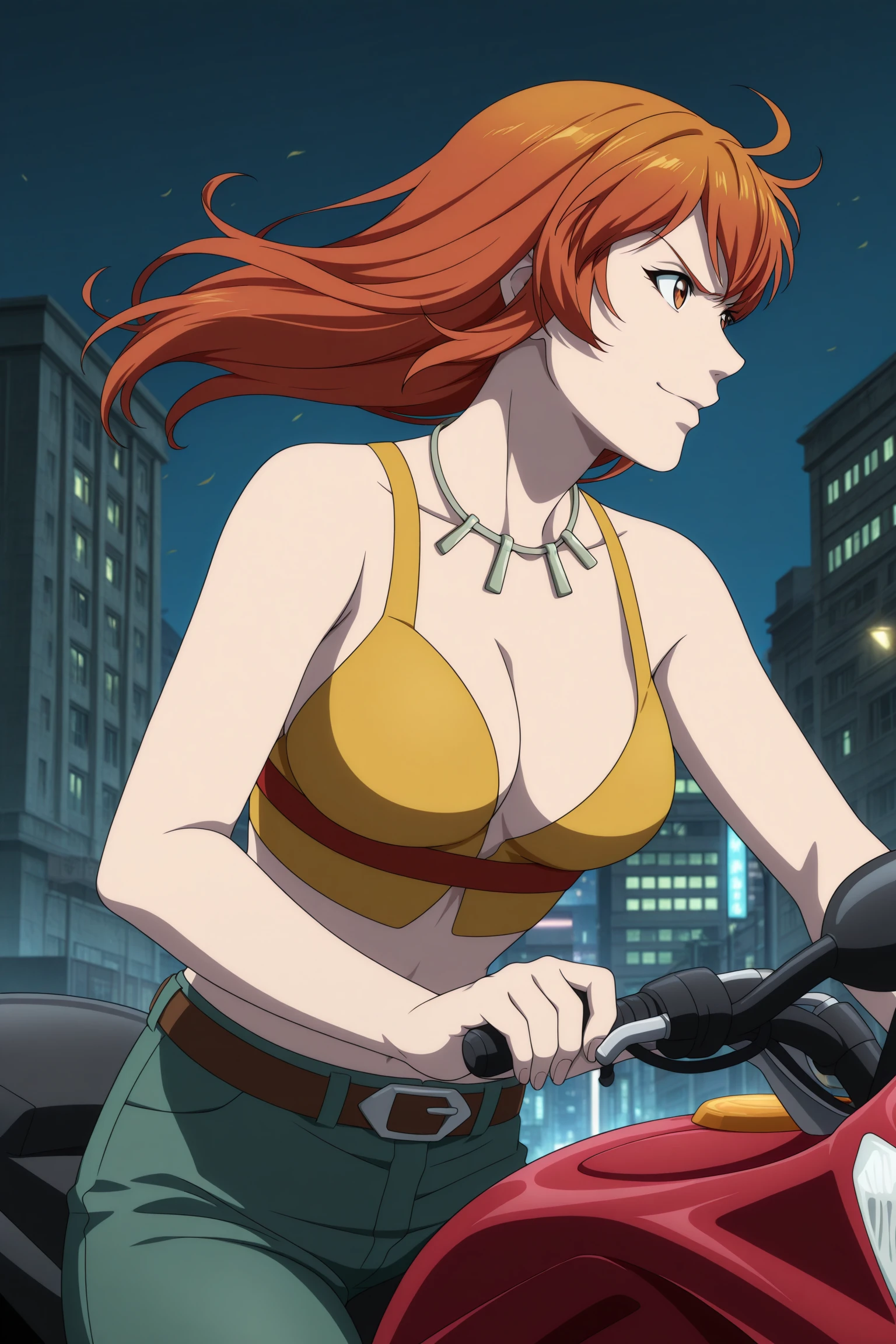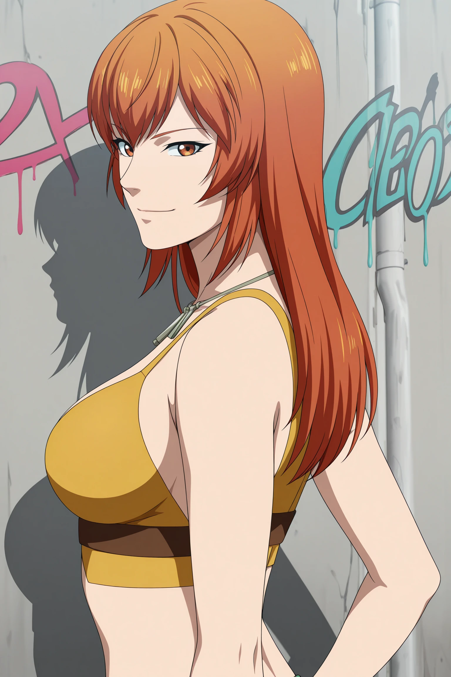 joy, long hair, orange hair, double-parted bangs, orange eyes, necklace, crop top, yellow shirt, underbust, belt, green pants, brown footwear, knee bootsOPTIONAL WORDS