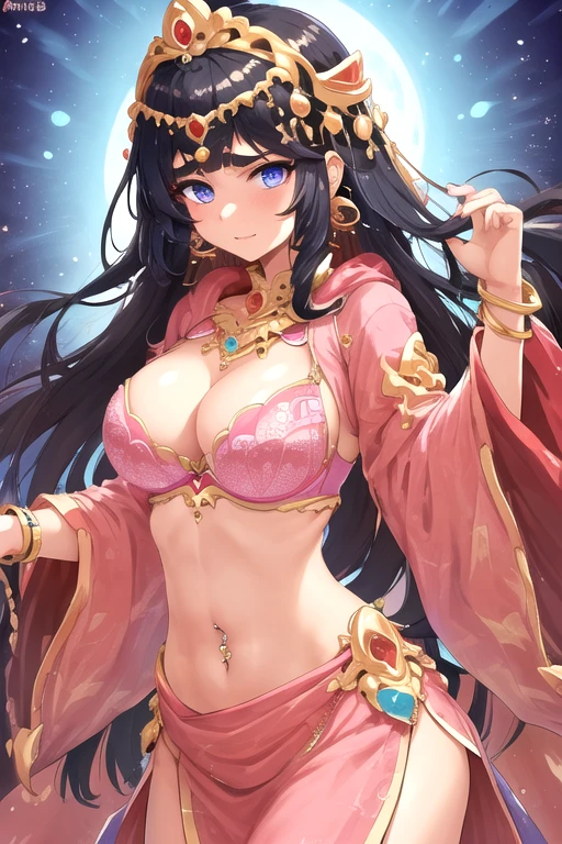 GaraniaWarAigis, 1girl, solo, long hair, blue eyes, large breasts, black hair, navel, jewelry, purple eyes, earrings, midriff, wide sleeves, necklace, bracelet, gem, navel piercing, pink dress, red bra