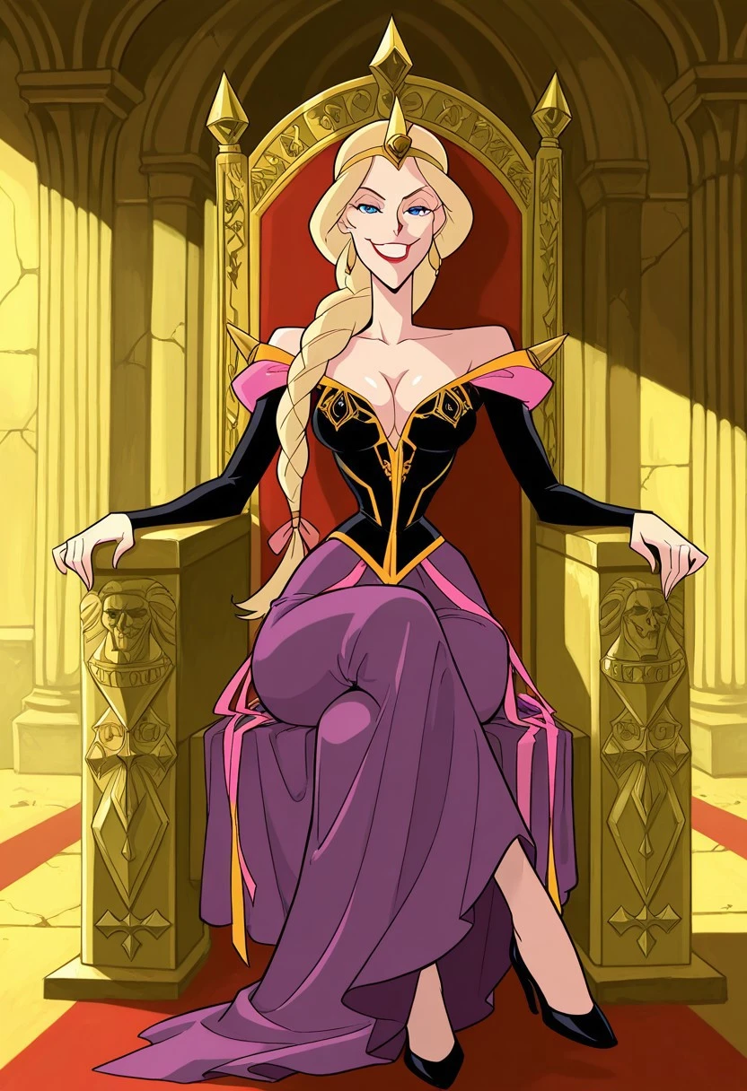 Tiara, earrings, black gold corset pink ribbons, black sleeves, purple skirt yellow ribbon, black heels