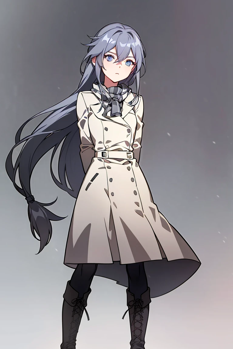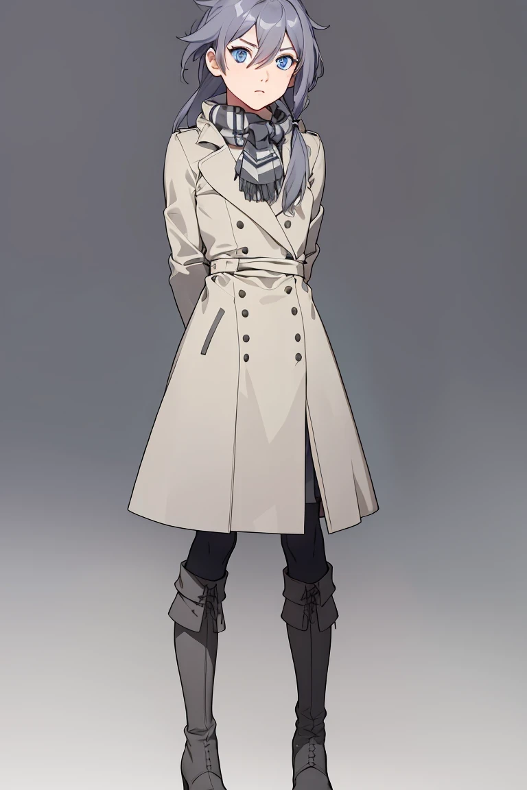 coat,jacket,black legwear,hair between eyes,blue eyes,boots,double-breasted,knee boots,low-tied long hair,lace-up boots,black footwear,checkered scarf,grey hair,