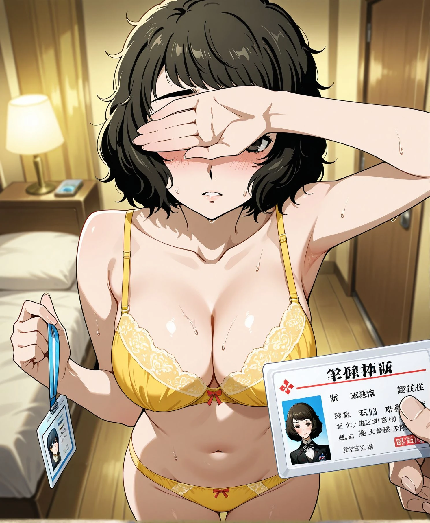 2.holding ID card, covering face,underwear only,