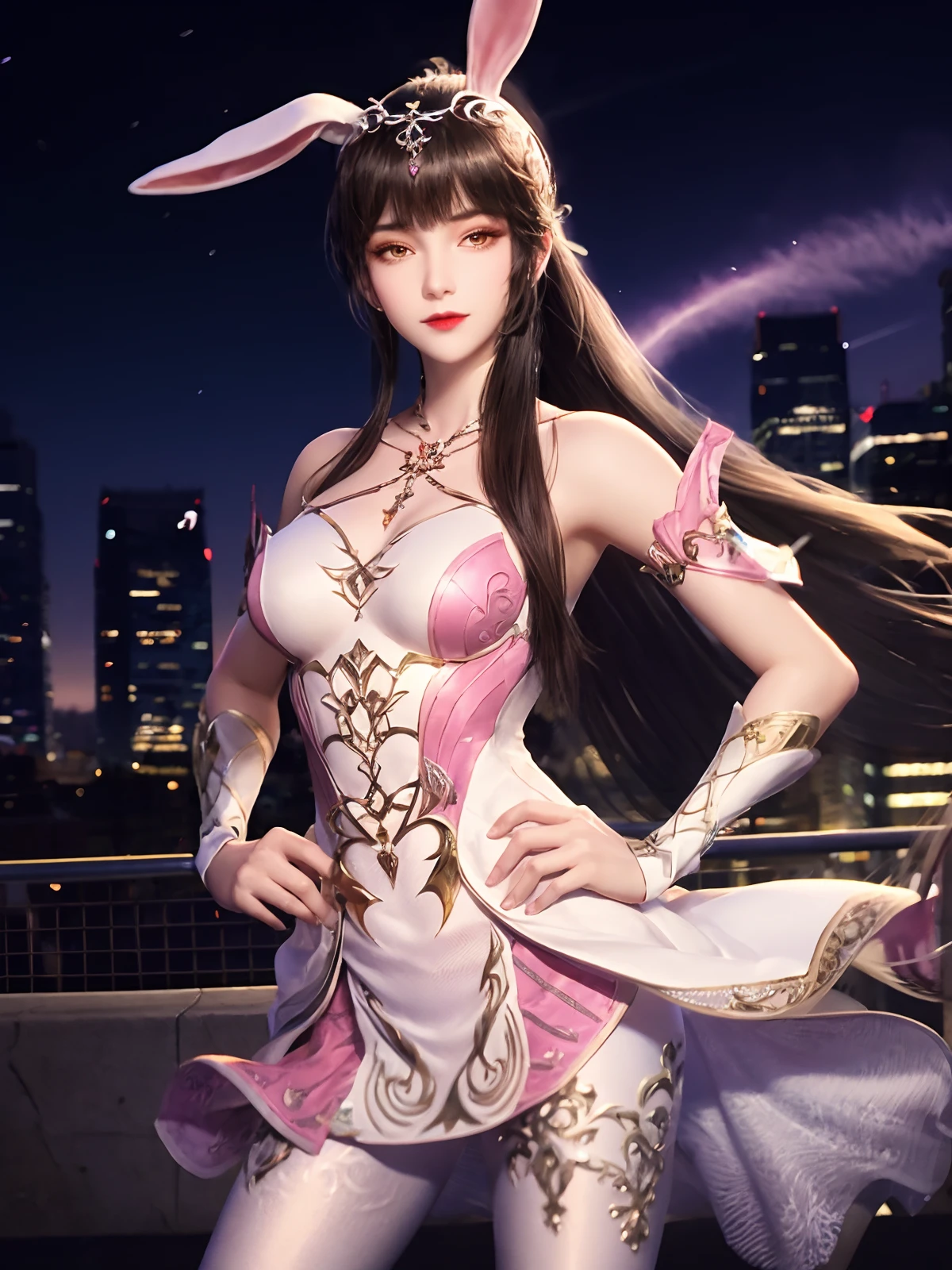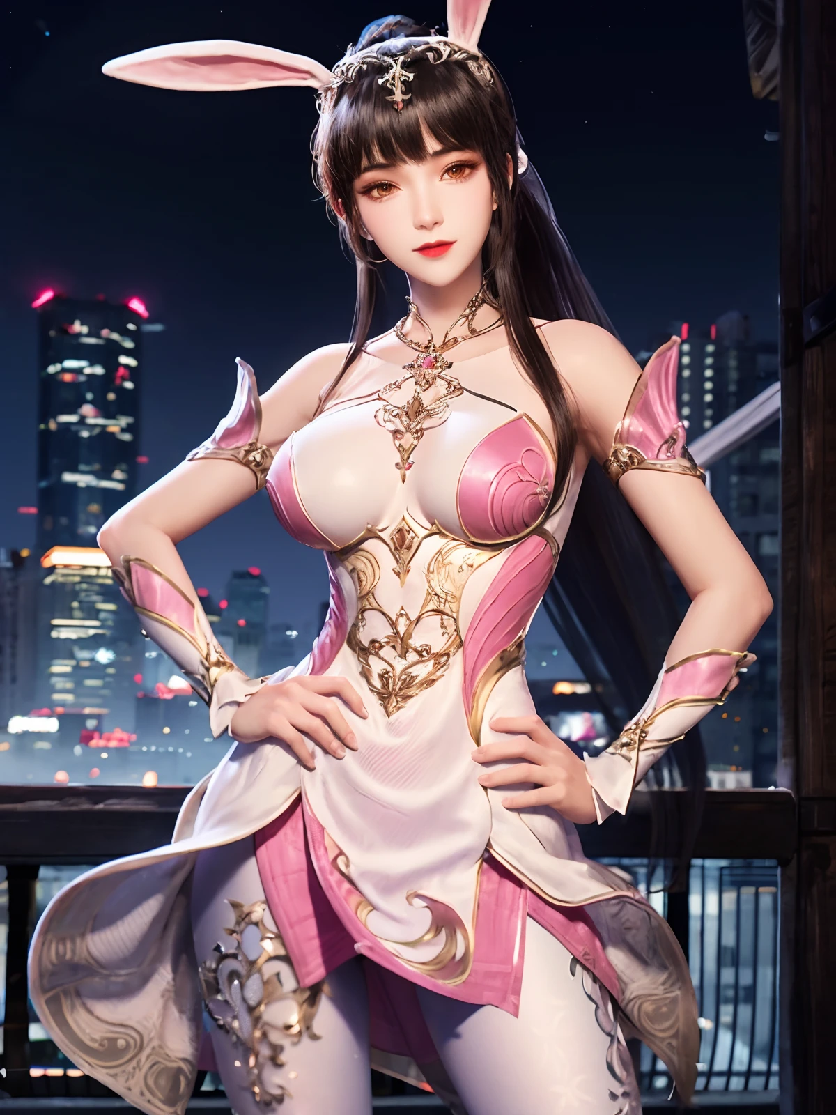 DLDLxiaowu, 1girl, solo, rabbit ears, brown hair, long hair,white pink dress, ponytail, hair ornament, jewelry, looking at viewer, white pantyhose,wrist cuffs, cityscape, night, (light smile:0.3), cowboy shot, hand on hip, metal collar,