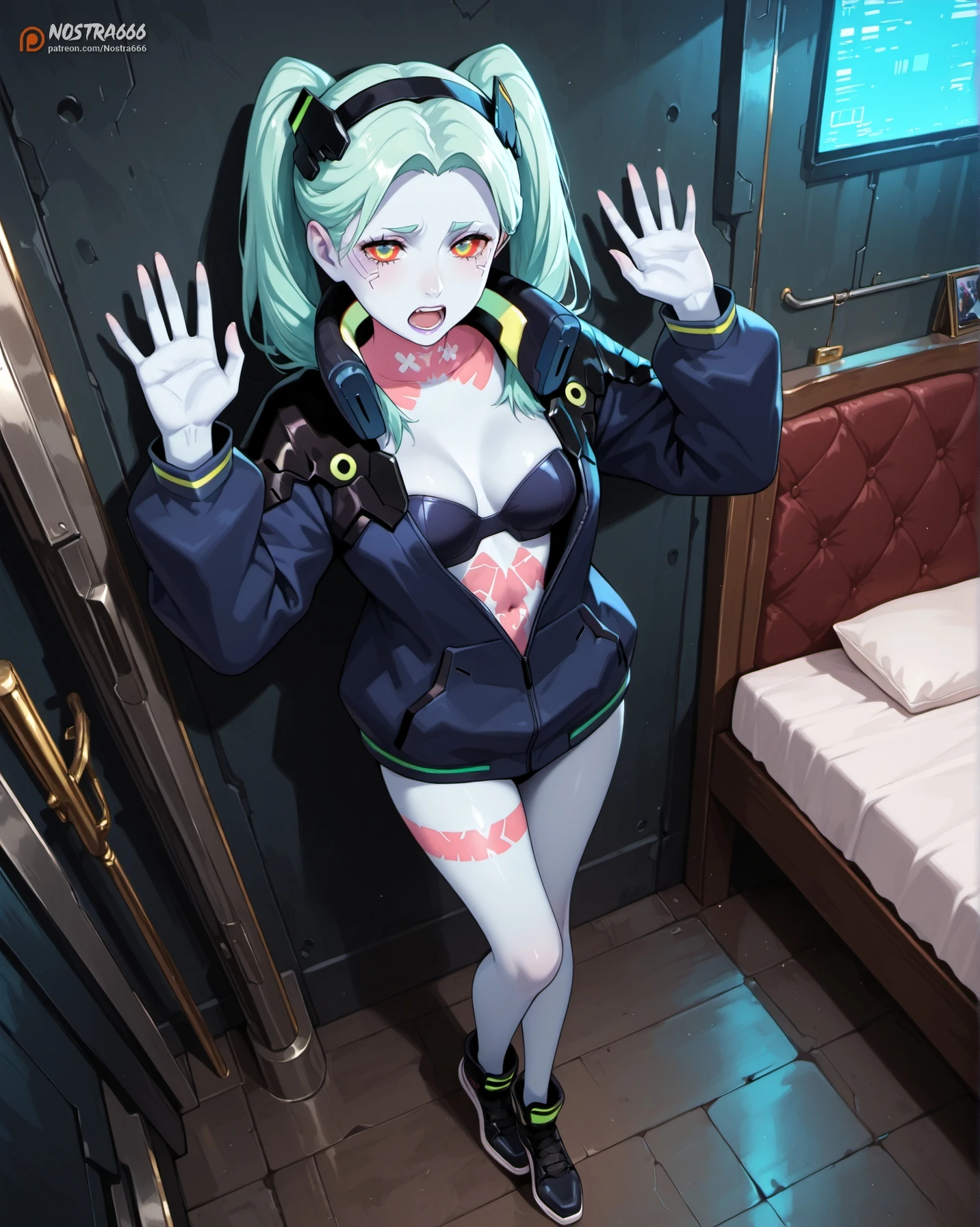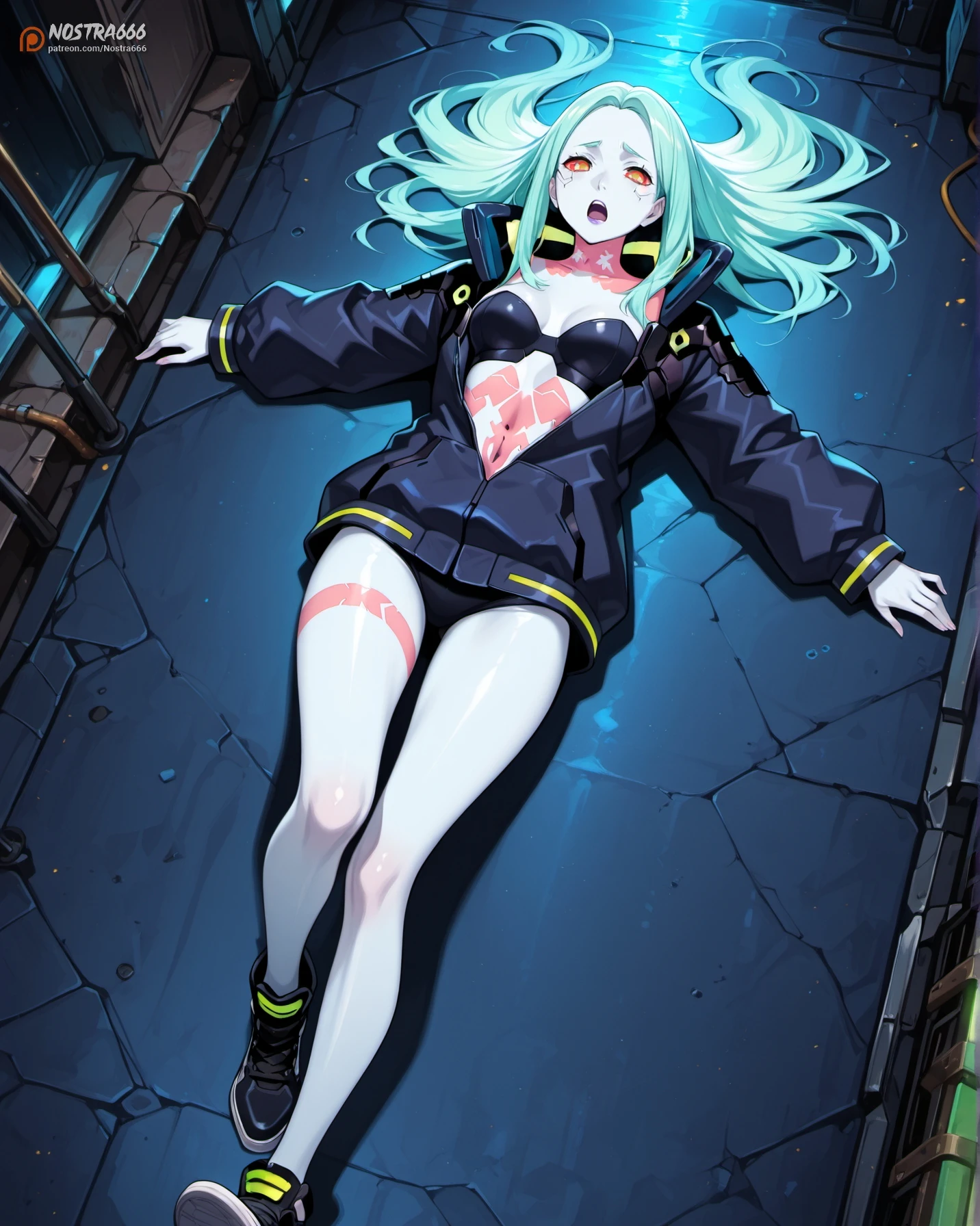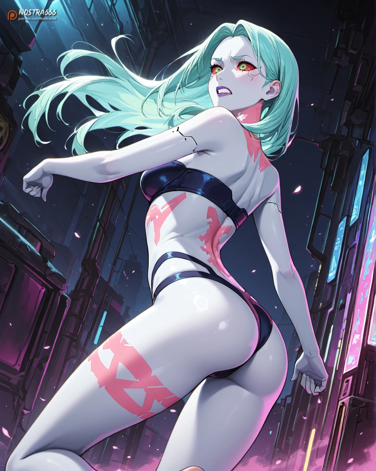 (NostraRebecca, (colored sclera, red sclera, green eyes, red pupils:1.1), colored skin, (grey skin, blue skin:1.2), aqua hair, green hair, long hair, purple lips, parted bangs, cyberskin, (tattoo, leg tattoo, stomach tattoo, neck tattoo:1.1), medium breasts, skinny, (slim, petite:1.1):1.1),
