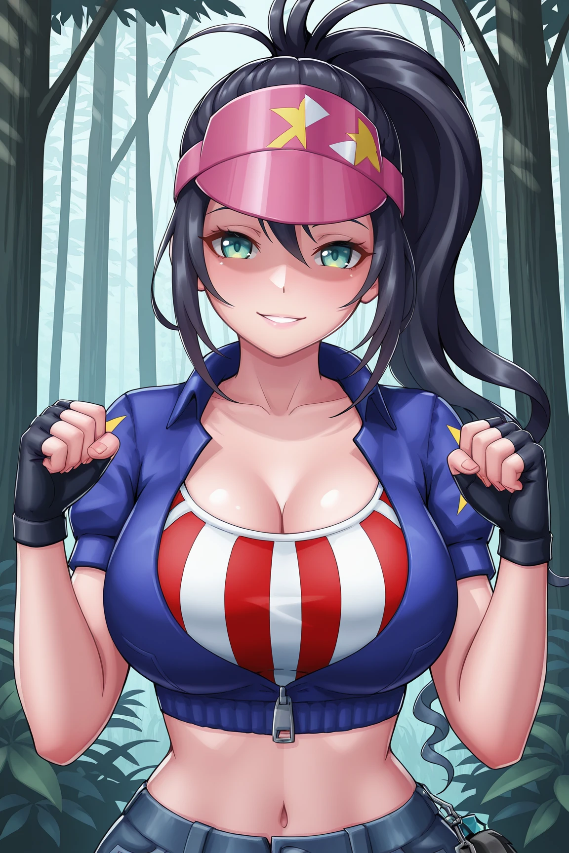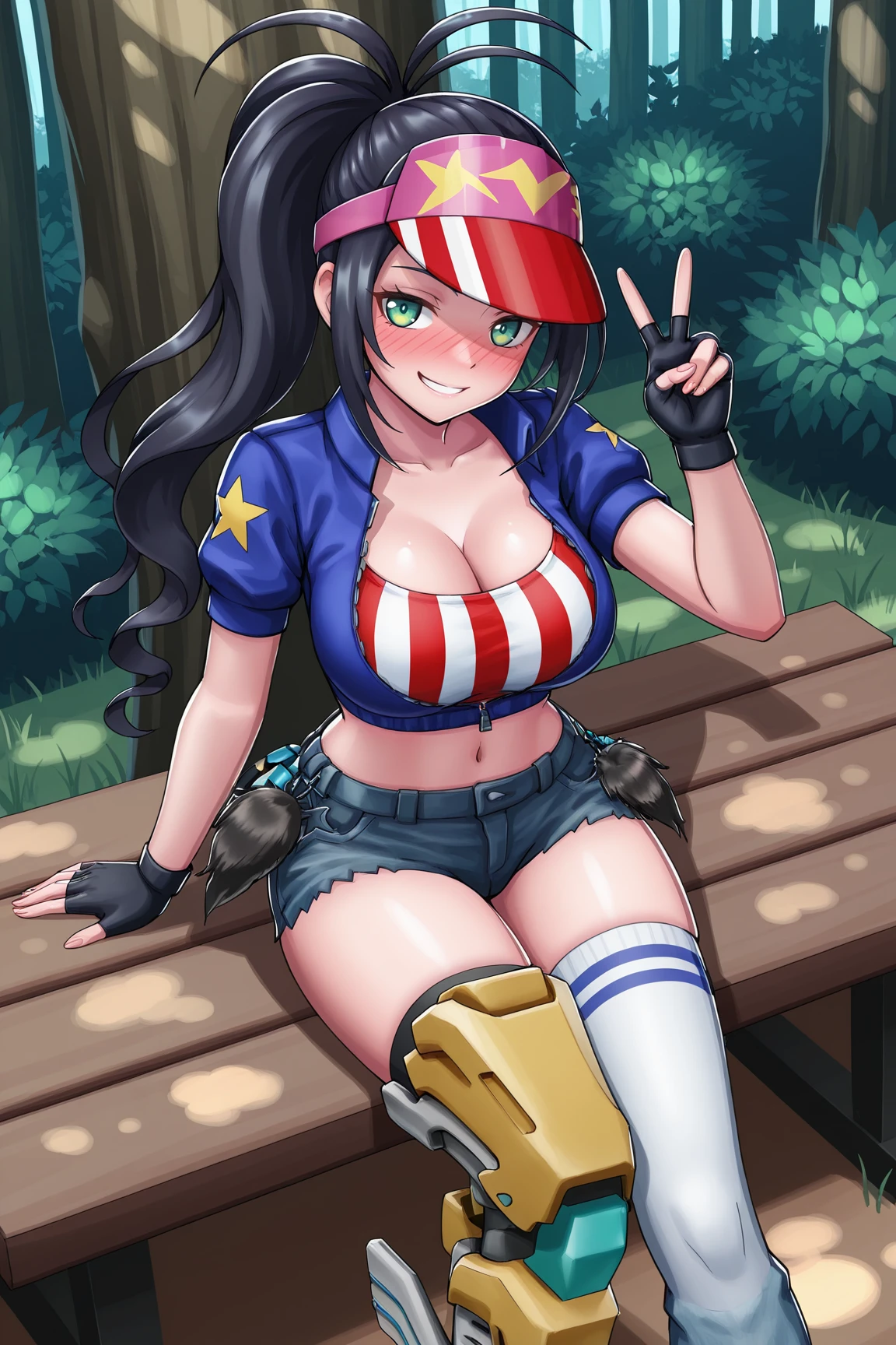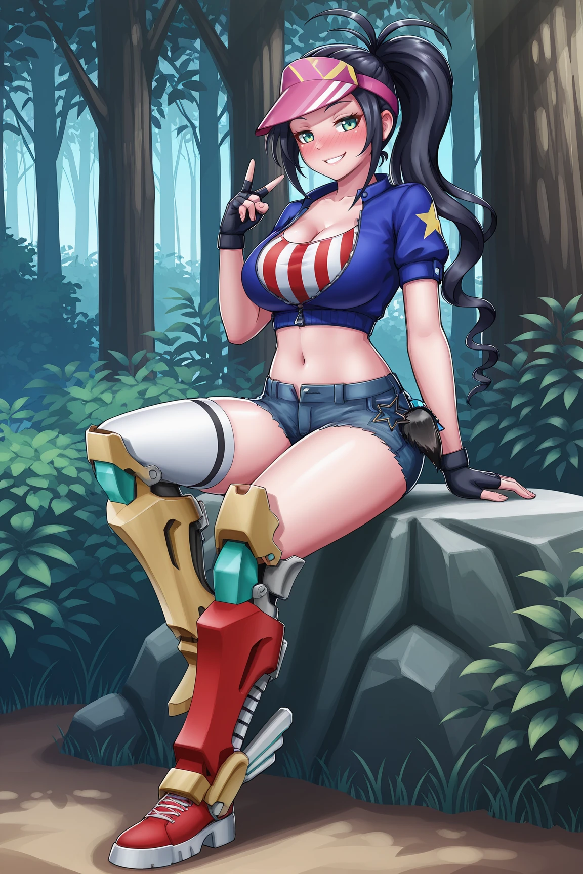 RitaMSAILXL, green eyes, black hair, long hair, ponytail, pink visor cap, large breasts, cleavage, blue crop top, denim shorts, black gloves, fingerless gloves, short shorts, single right robot leg, single white thighhigh, red shoes