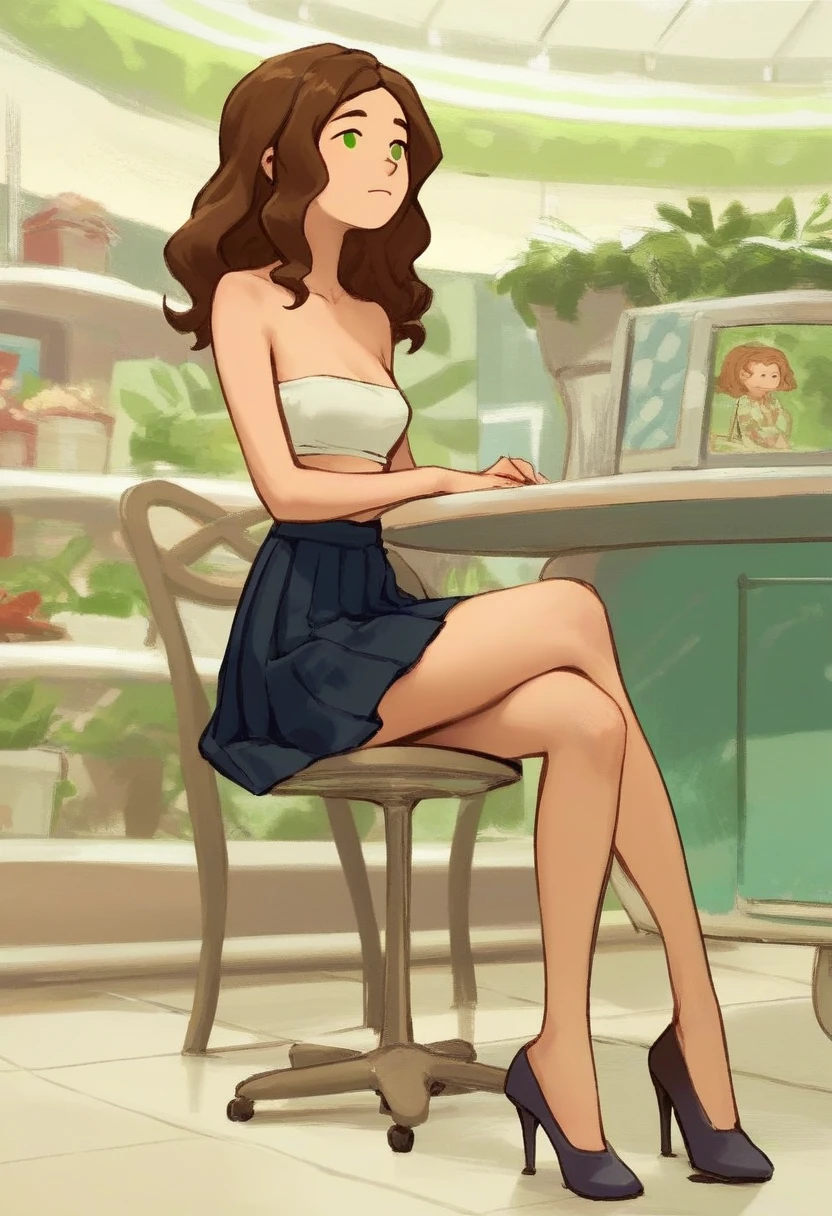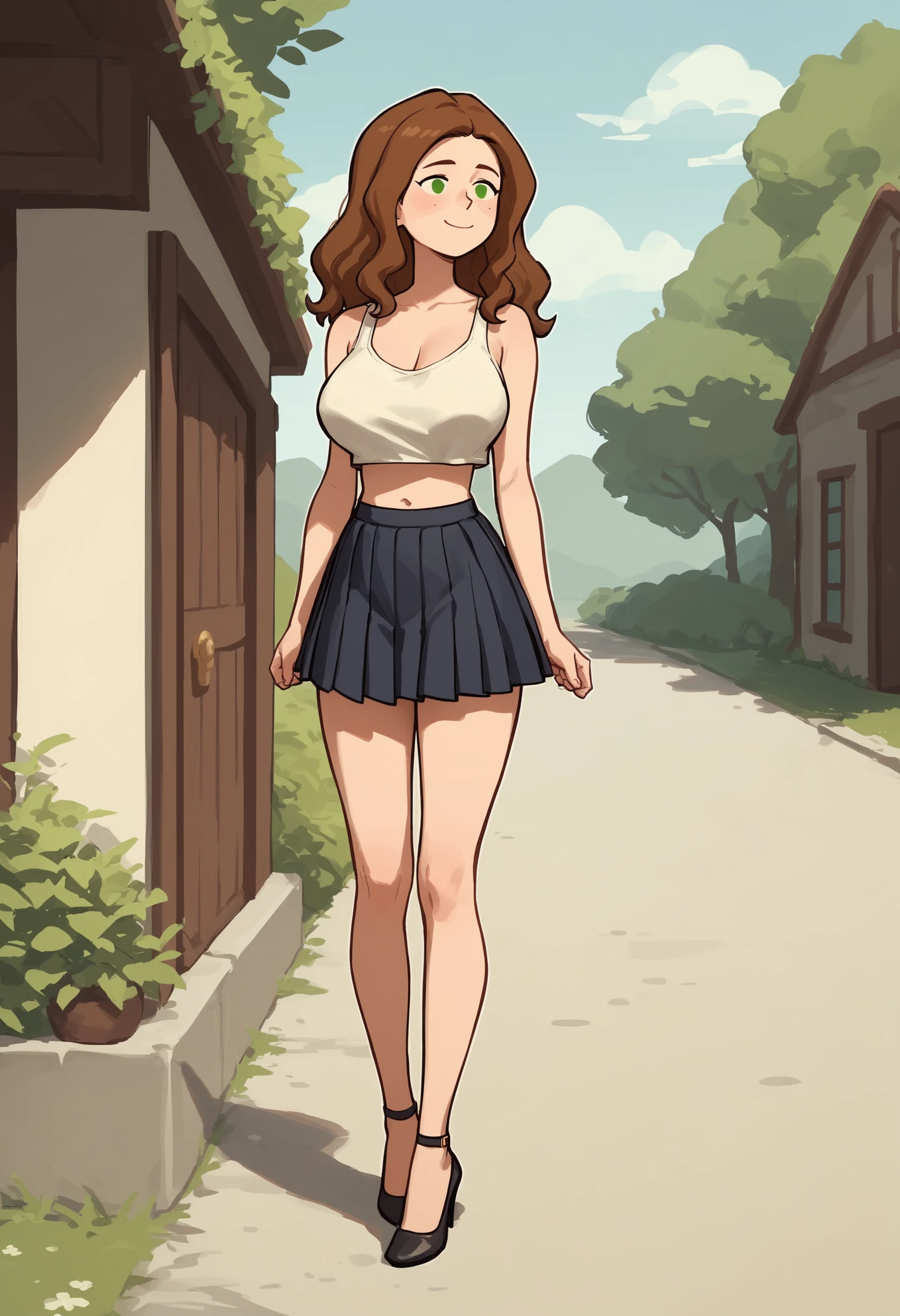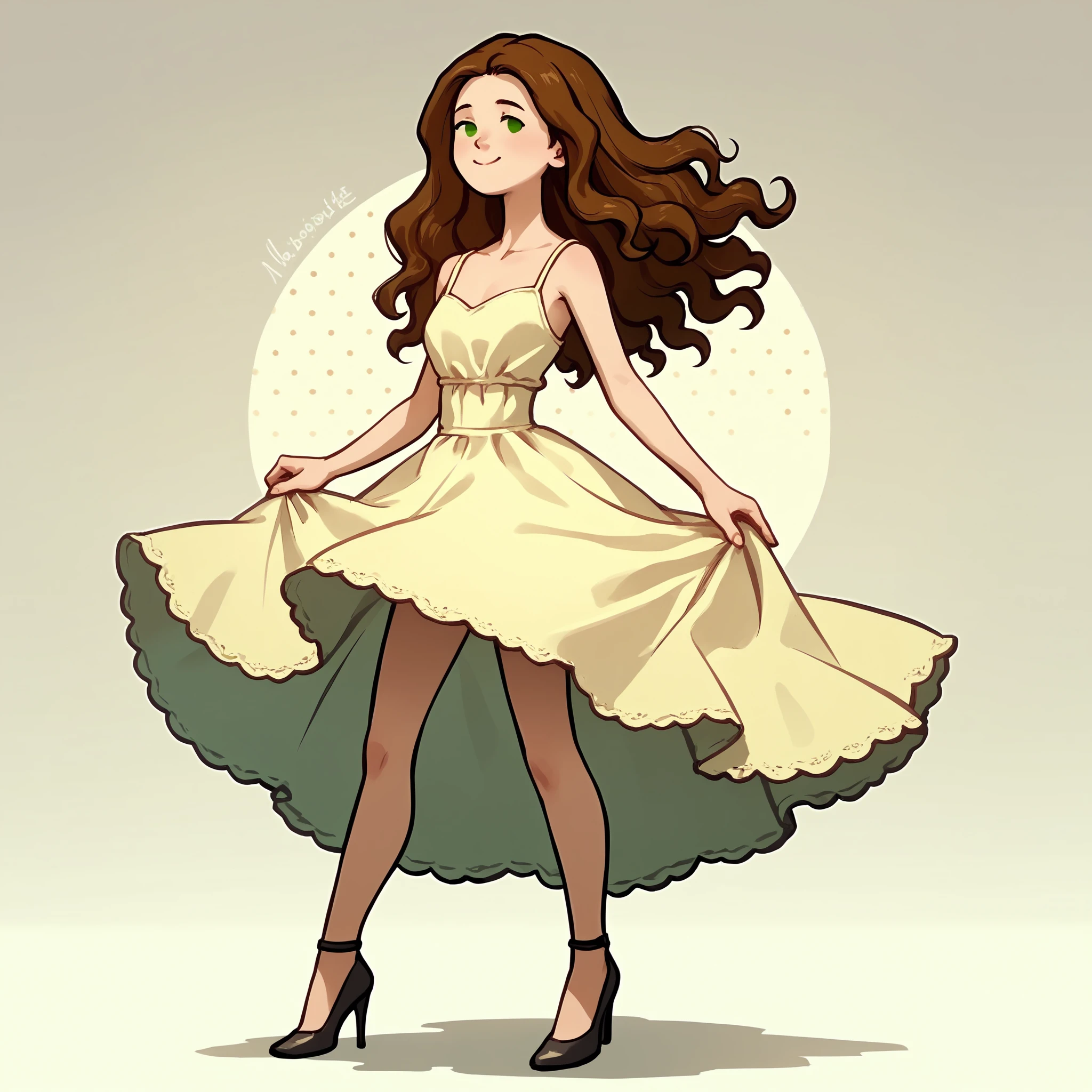 Abigail_Storybooth, wavy hair, brown hair, green eyes, dot eyes,